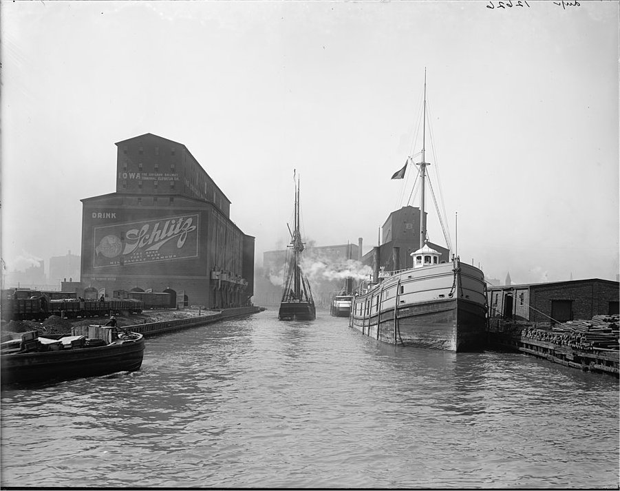 View looking north along the South Branch of the Chicago River at 14th Street in 1900. The Iowa, Rock Island "A" and Rock Island "B" grain elevators are visible.