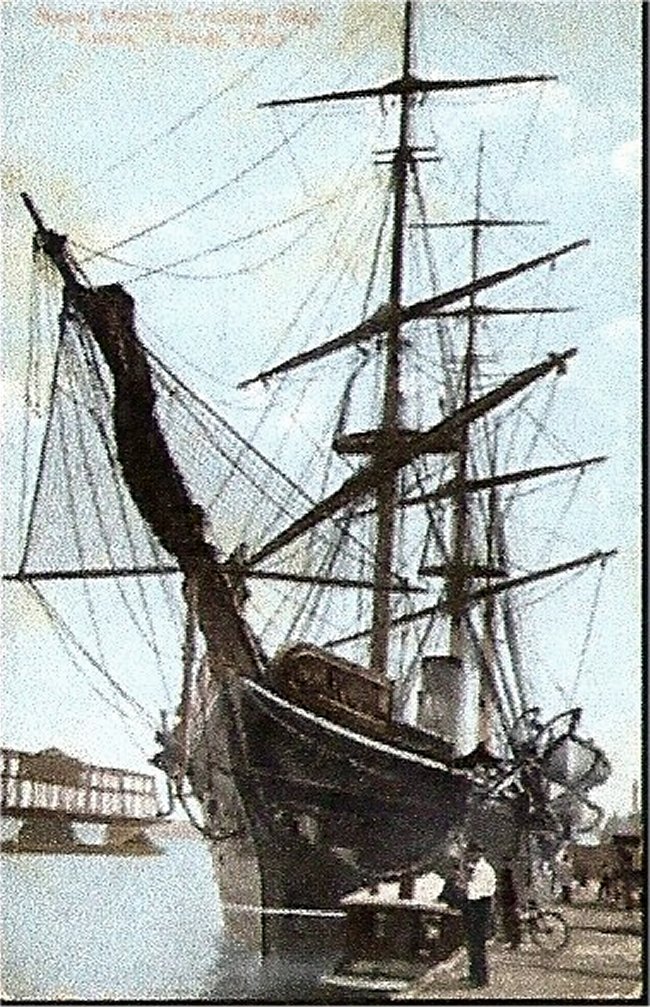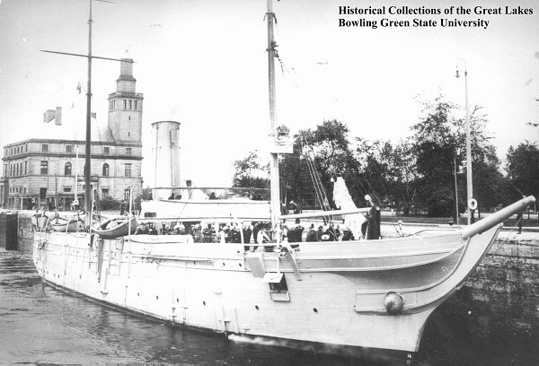 36k | Essex port bow view at Fairport OH. for "Perry Day" celebrations showing white hull and one yard on each mast, 14 July 1913. | Institute for Great Lakes Research, Bowling Green State University | |