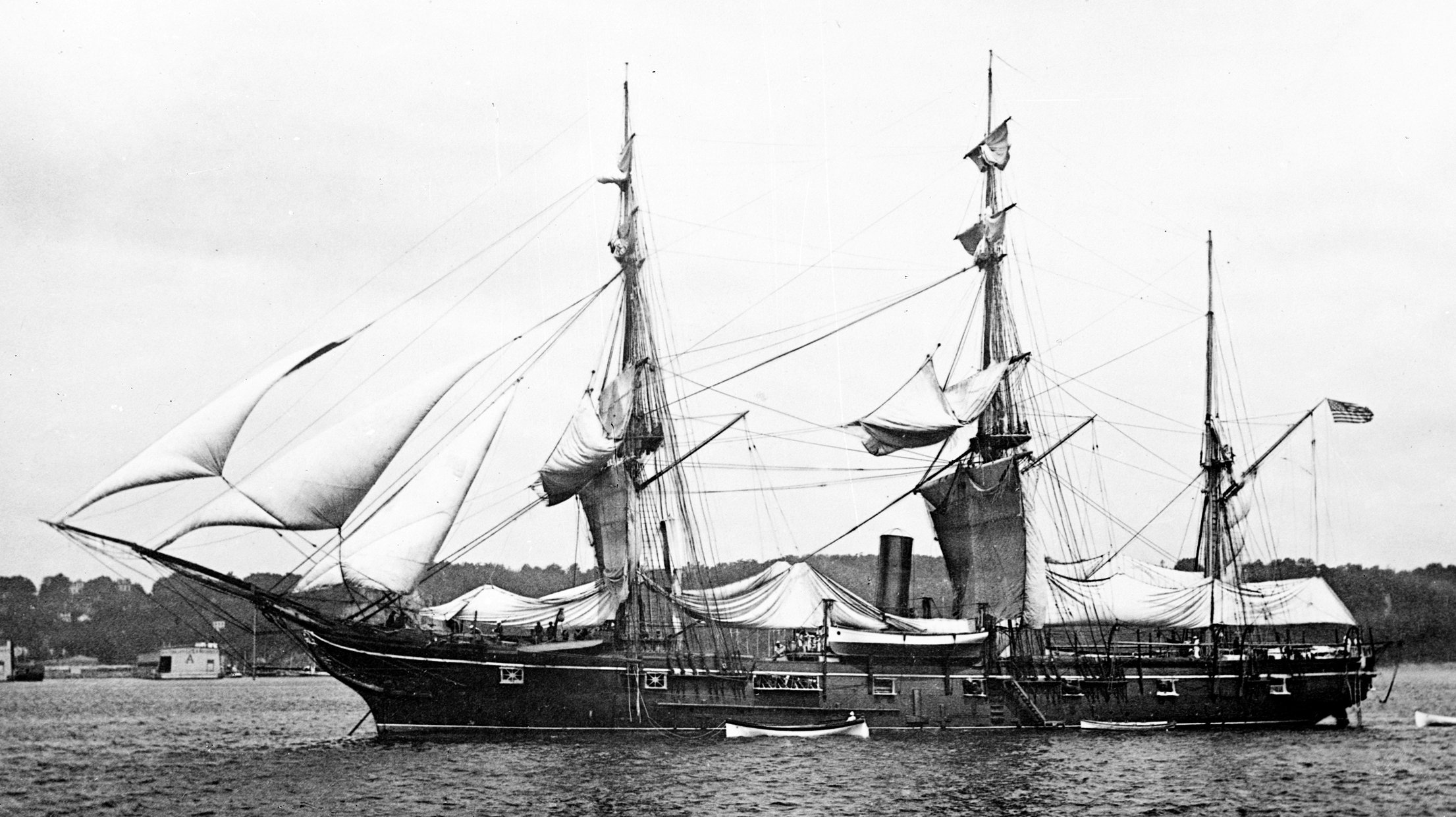 469k | USS Essex at anchor, circa 1876, location unknown. Photo from the collections of the Library of Congress. |