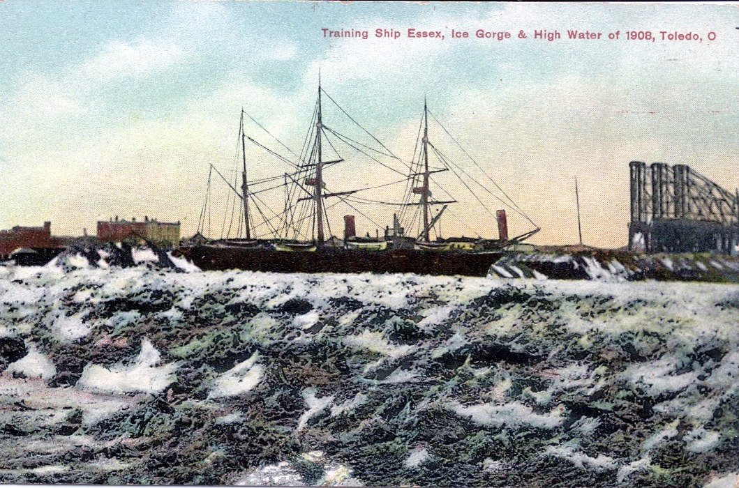 302k | Post card image of Naval Training Ship Essex moored at Toledo, OH., winter 1908 with ice gorge and high water. Published by J. G. Bautelle, Toledo, OH. |
