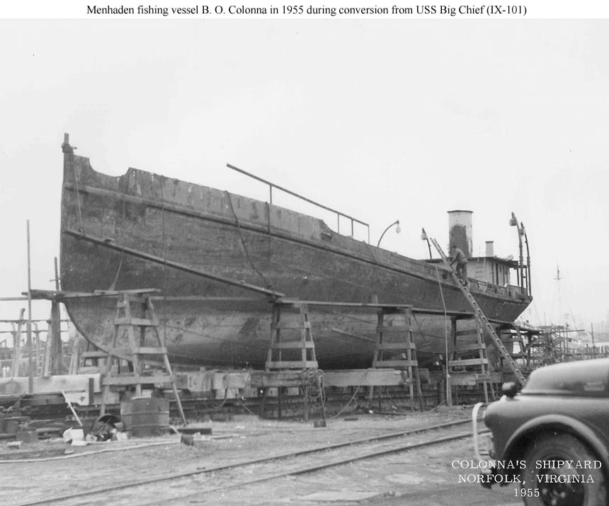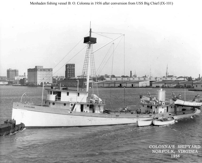 95k | Ex-Big Chief (IX-101) in 1955 during conversion to a menhaden fishing vessel by Colonna's Shipyard, Inc., Norfolk, VA. Her high forecastle has been cut down and only the smokestack and the lower portion of the deckhouse were retained aft. Colonna's Shipyard. Photo courtesy Shipscribe.com. | Robert Hurst | |