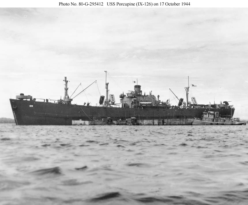 USS Porcupine (IX-126) at anchor, 17 October 1944, in the Southwest Pacific. US National Archives photo # 80-G-295412 a US Navy photo now in the collections of the US National Archives, courtesy Shipscribe.com |