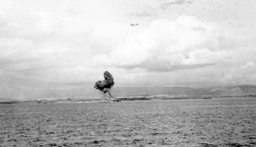 USS Porcupine (IX-126), filled with aviation fuel, is struck by a kamikaze plane about 1549, 30 December 1944, off White Beach, Mangarin Bay, Leyte, PI. Porcupine was attacked by five Japanese Vals. The successful attacker dropped a bomb on Porcupine, then crashed into the ship, killing seven of her crew and wounding eight others. Attempts to stop the resulting fire from reaching the aviation fuel failed. Porcupine burned to the water line. |