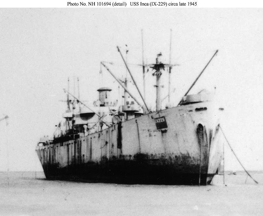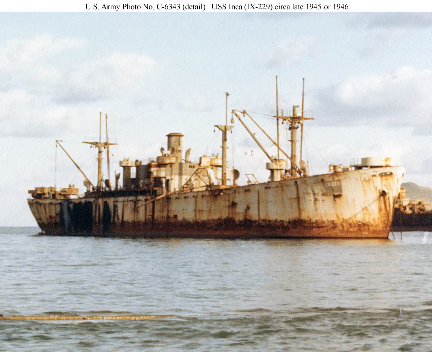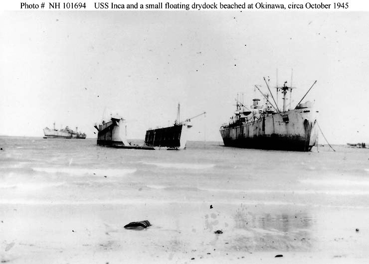 44k | Inca (IX-229) aground in Buckner Bay, Okinawa next to a small floating drydock after they were blown ashore by a typhoon 9 October 1945. Another "Liberty" ship is in the left distance. In the original image, Inca's hull number (IX-229) is clearly visible in the dark patch on her starboard bow. US Navy History and Heritage Center photo # NH 101694, courtesy Dr. Herbert F. Gabriel, DDS, 1987. |