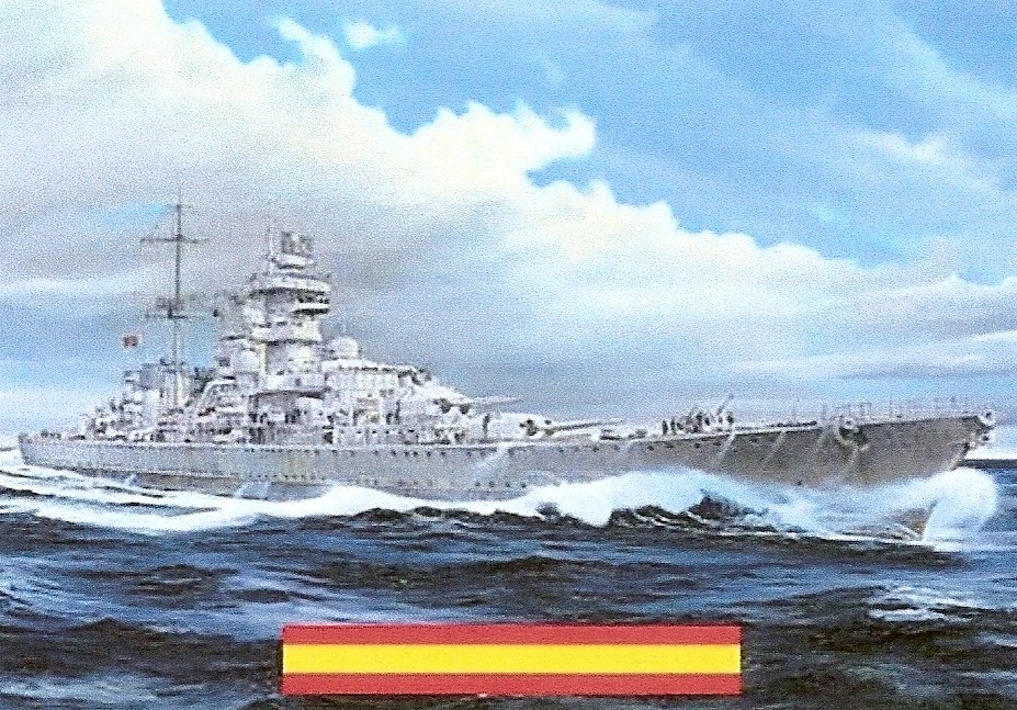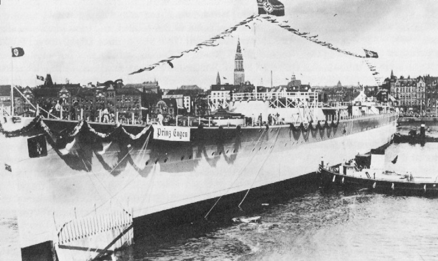 104k | KMS Prinz Eugen after launching at Krupp's Germania Werft Yard, Kiel, Germany, 20 August 1938. Note the conventionally stowed anchors and her coat of arms painted on her straight bow. Imperial War Museum photo from "German Cruisers of World War Two", by M. J. Whitley. |