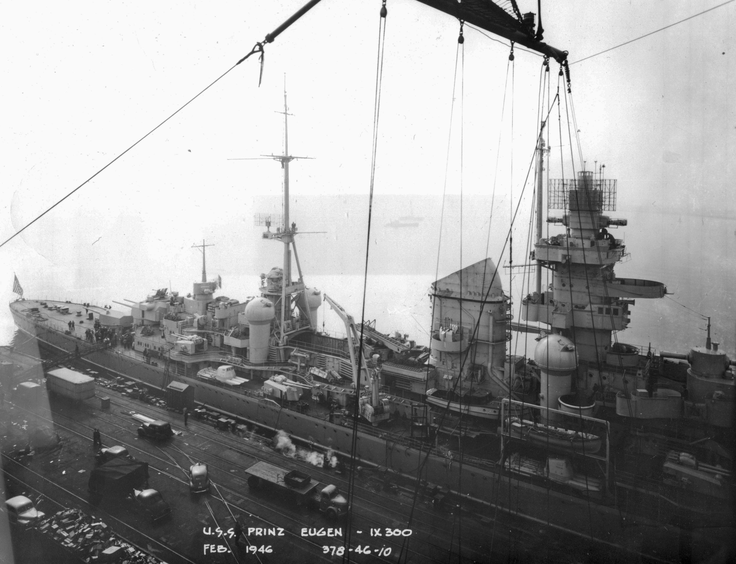 officially Prinz Eugen (IX-300), off the Philadelphia Naval Shipyard, PA. Prinz Eugen had a crew of 8 officers and 85 enlisted men of the