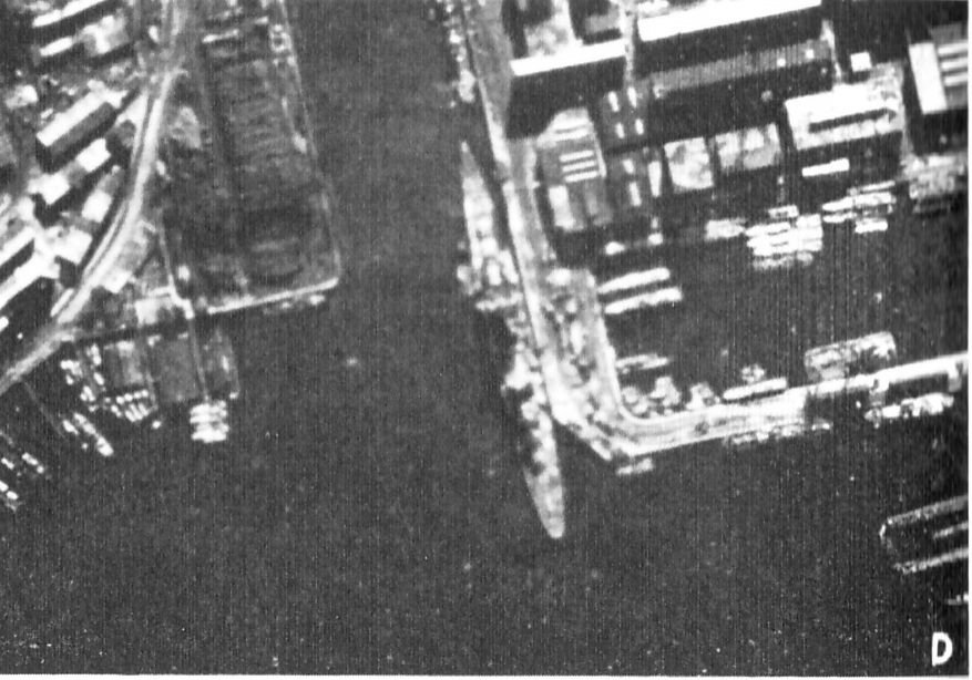 106k | An overhead RAF photo recon image of KMS Prinz Eugen tied up at the Germania yard, Kiel after having had a new stern fitted. Photos and text from "Looking Down on War: Axis Warships As Seen on Photos From Allied Intelligence Files" by Colonel Roy M. Stanley 11, USAF (Retd). Pen and Sword Maritime, Pen and Sword Books Ltd., 47 Church Street, Barnsley, South Yorkshire. ISBN 978 184884 471 1 |
