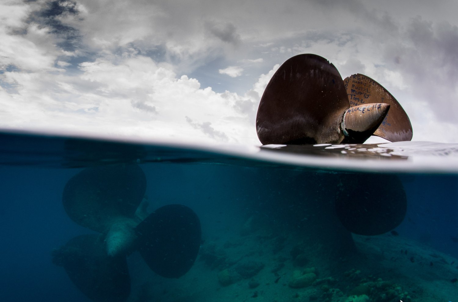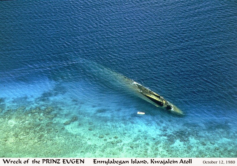124k | The wreck of Prinz Eugen (IX-300) at Enubuj Island, Kwajalein Atoll sits upside down, with her rudder and two remaining propellers partially out of the water.