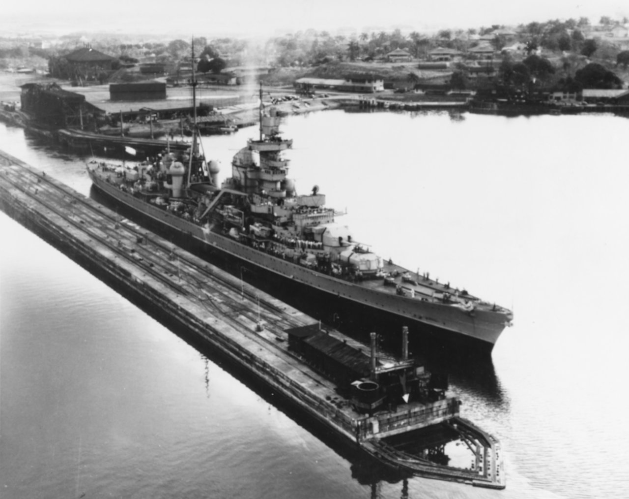 139k | Prinz Eugen (IX-300) passing through the Gatun locks, Panama Canal, 15 March 1946. Note the guns of A turret are missing.