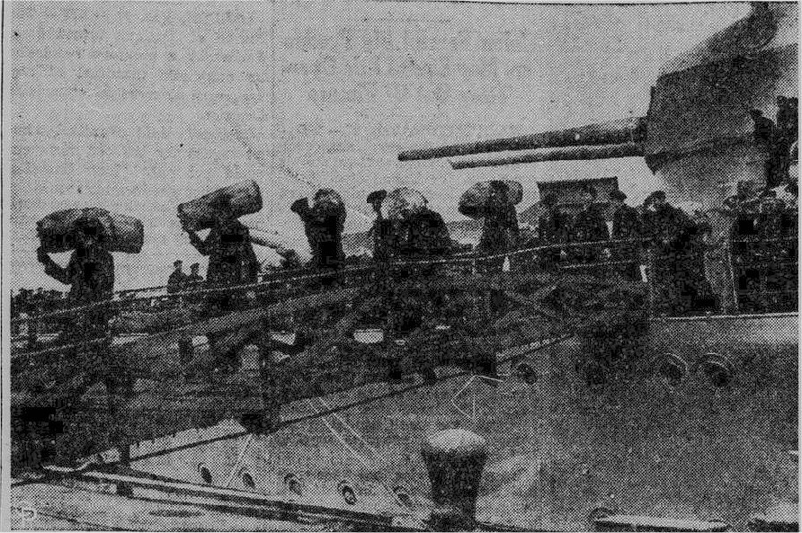 247k | Newspaper caption -"CREW MEMBER OF TH NAZI CRUISER >Prinz Eugen are shown as they filed down the gangplank of the ship at the naval base in