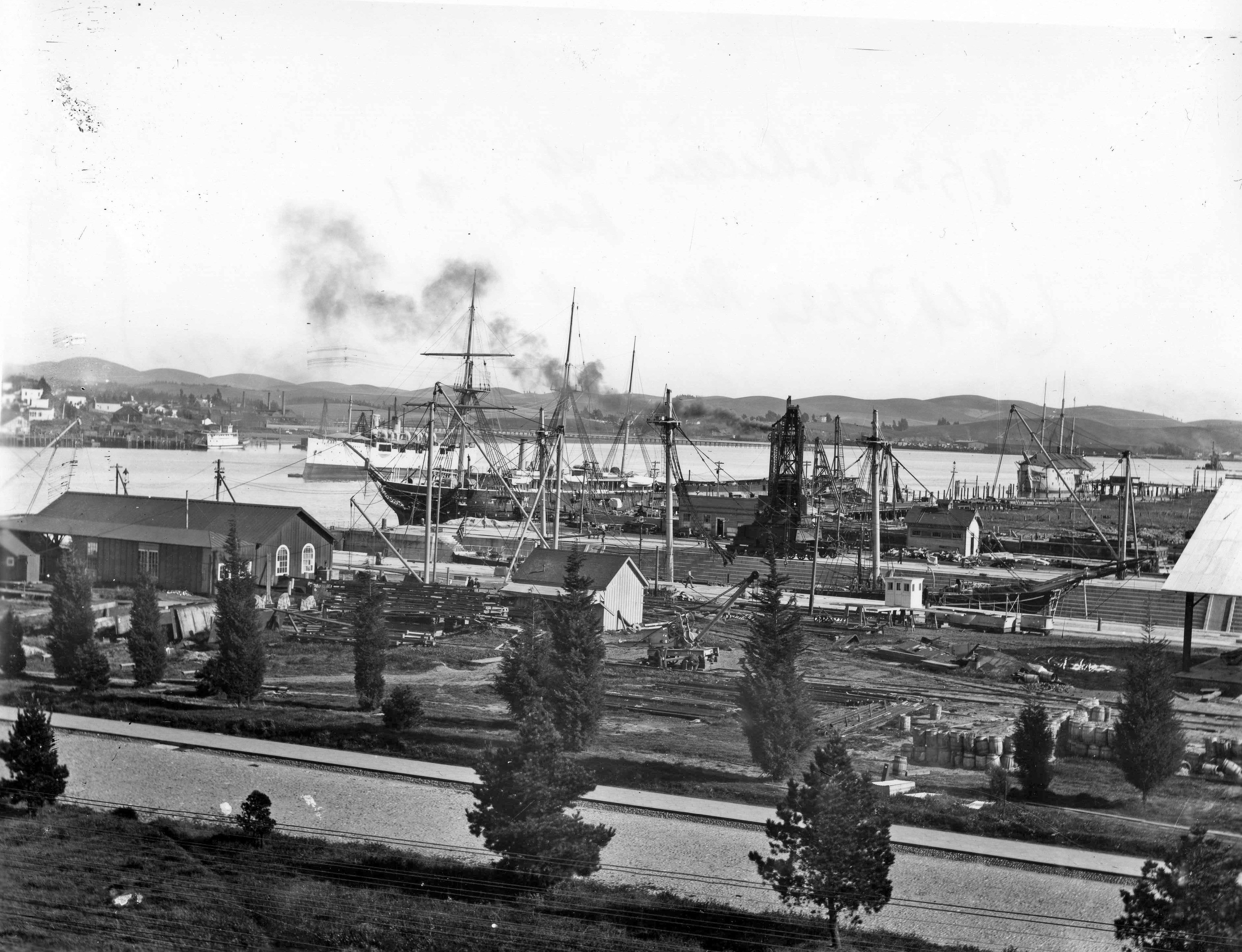 View looking along the waterfront of Mare Island Navy Yard during the 1870s, with the city of Vallejo on the opposite side of the channel.