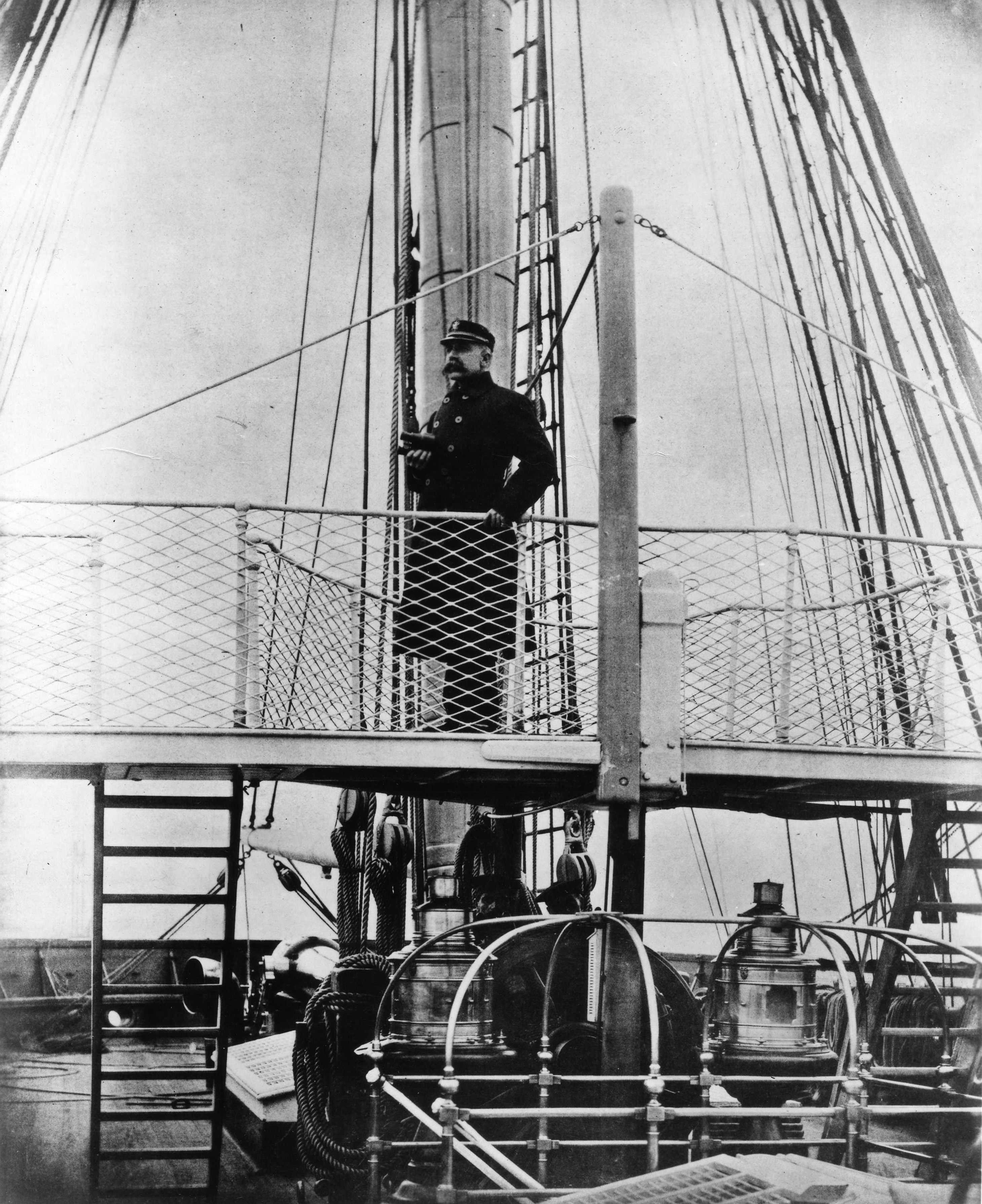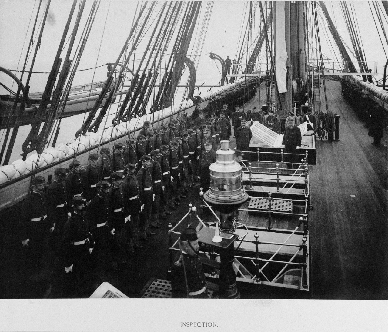 Captain George Dewey, her Commanding Officer, is in the middle of the group of officers on the bridge. Note men sweeping deck, and standing by with belaying pins, ready
