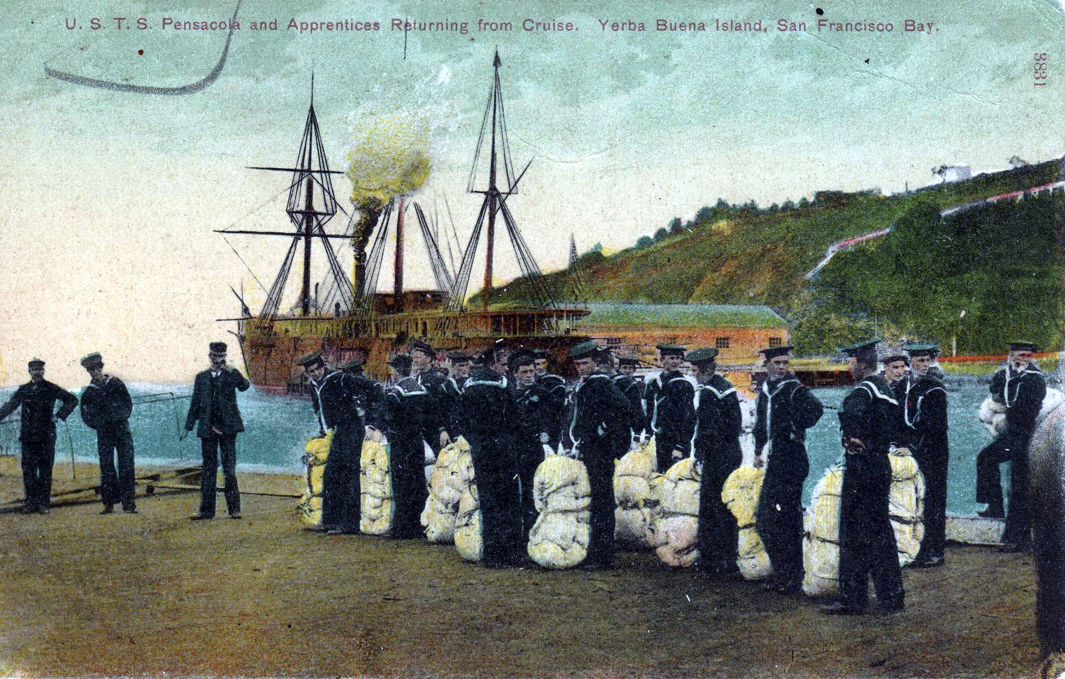 Post card by A. Cruz of USS Pensacola at Yerba Buena Island circa 1898. Apprentices returning from a cruise. |