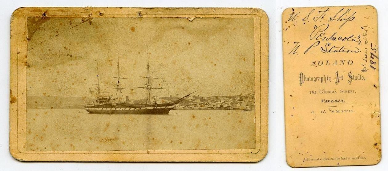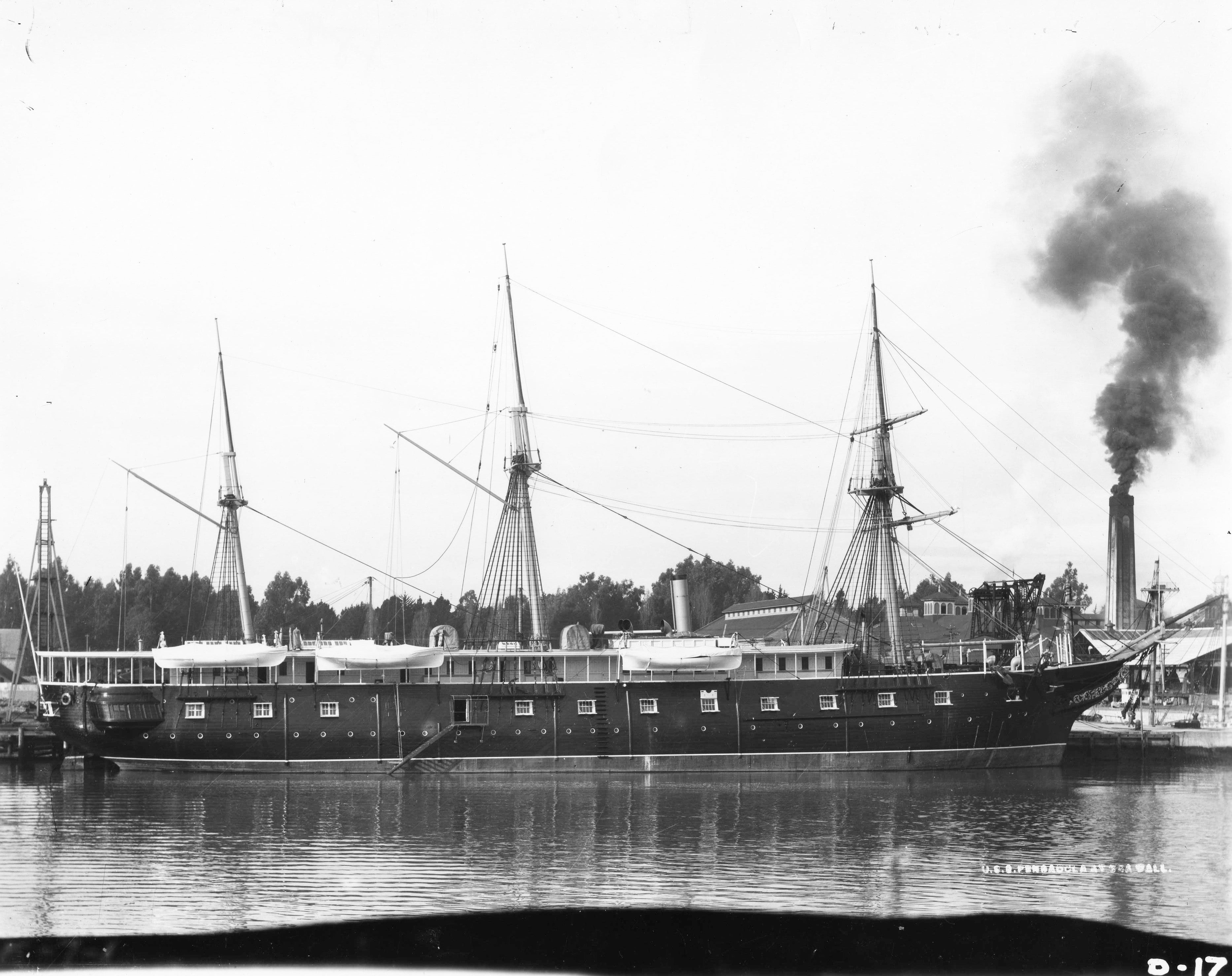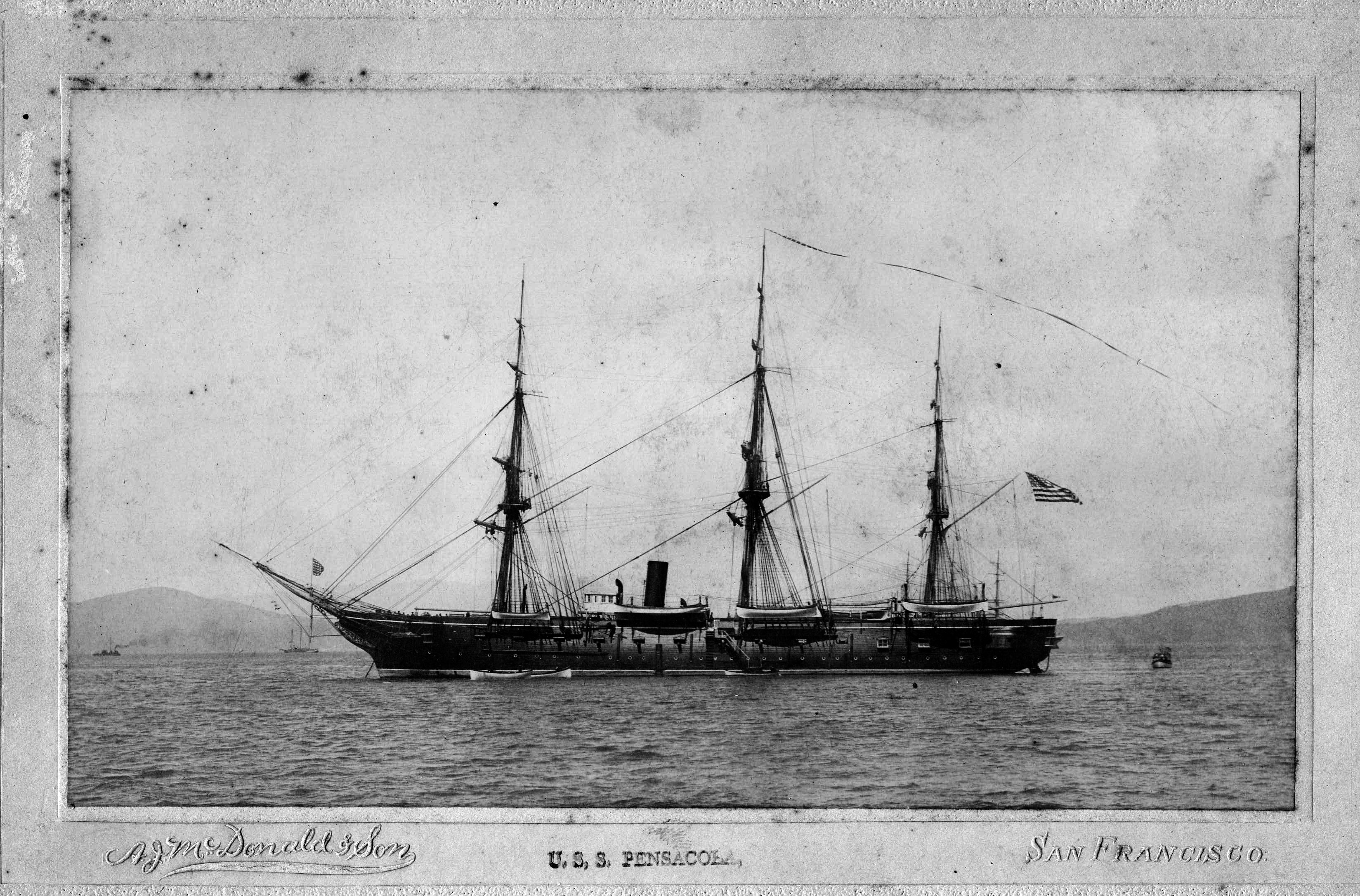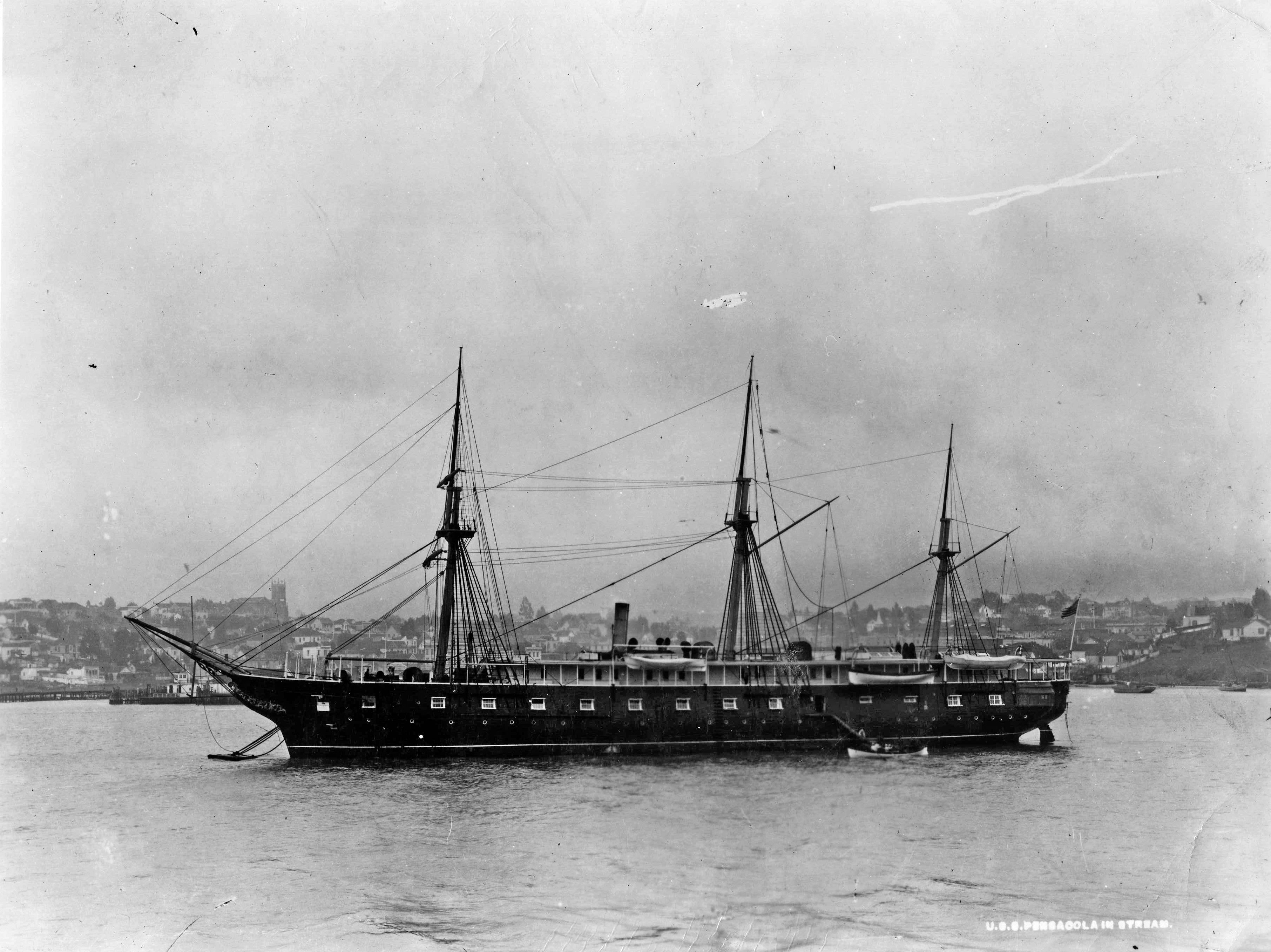 USS Pensacola serving as flagship of the North Pacific Squadron in 1869, probably at San Francisco. She served her entire