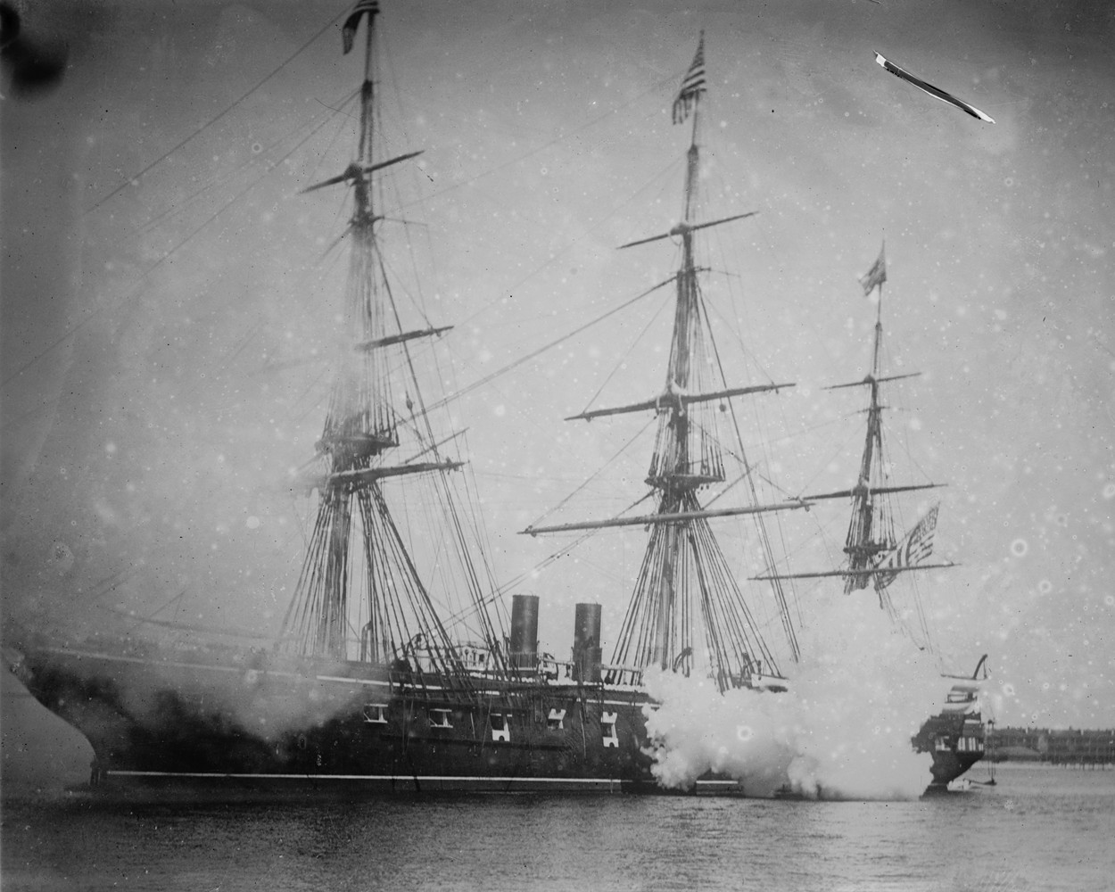 Steam frigate USS Pensacola firing her guns, circa 1879-late 1880s. |