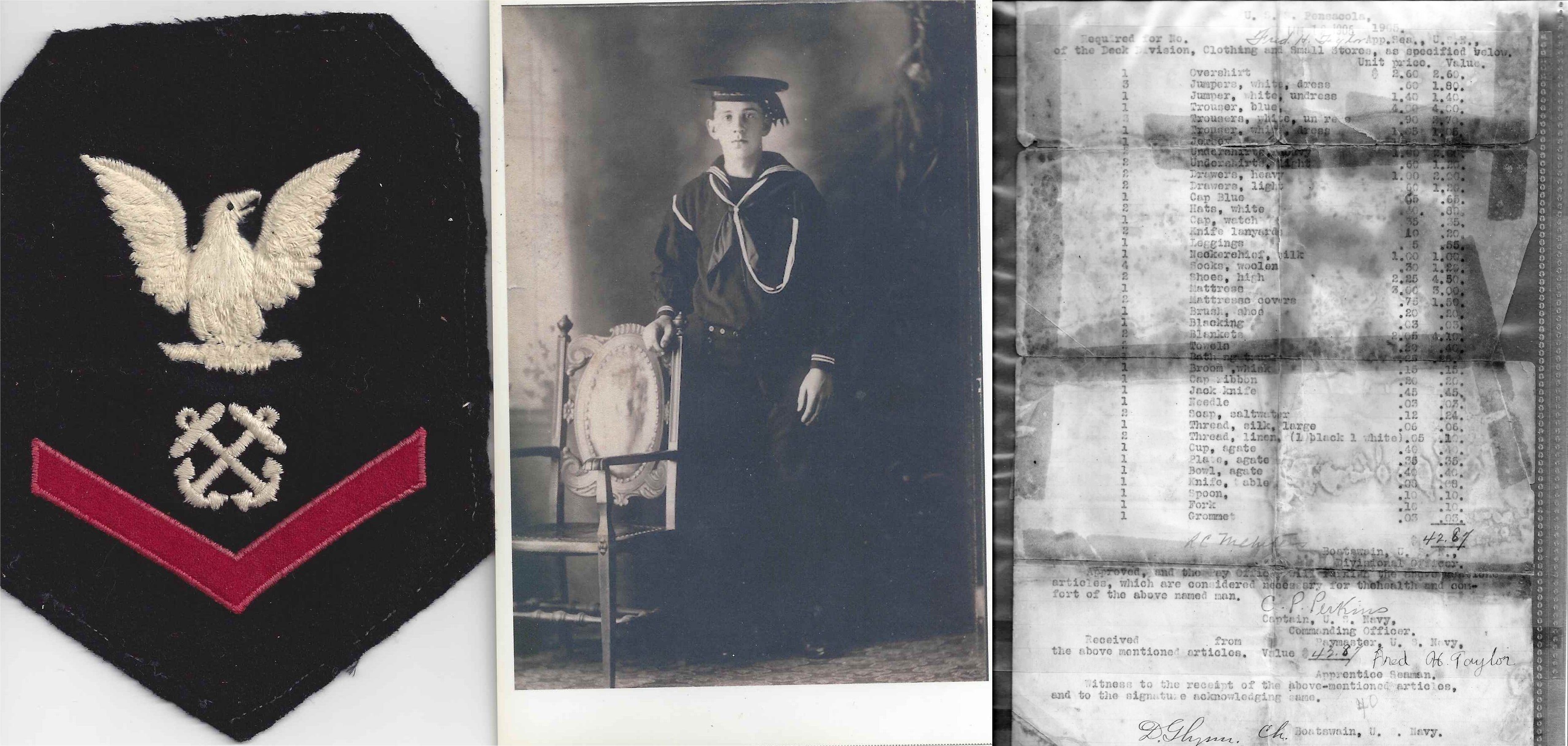 Standard seabag issue (clothing and small stores) for Apprentice Seaman Fred H. Taylor, USN, Deck Division USS Pensacola,