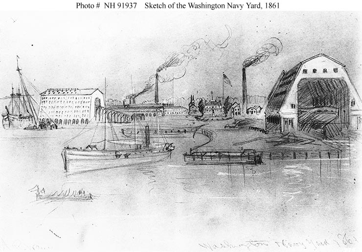 96k | Sketch of the Washington Navy Yard, looking north from off the waterfront in 1861. USS Pensacola is fitting out at left, near