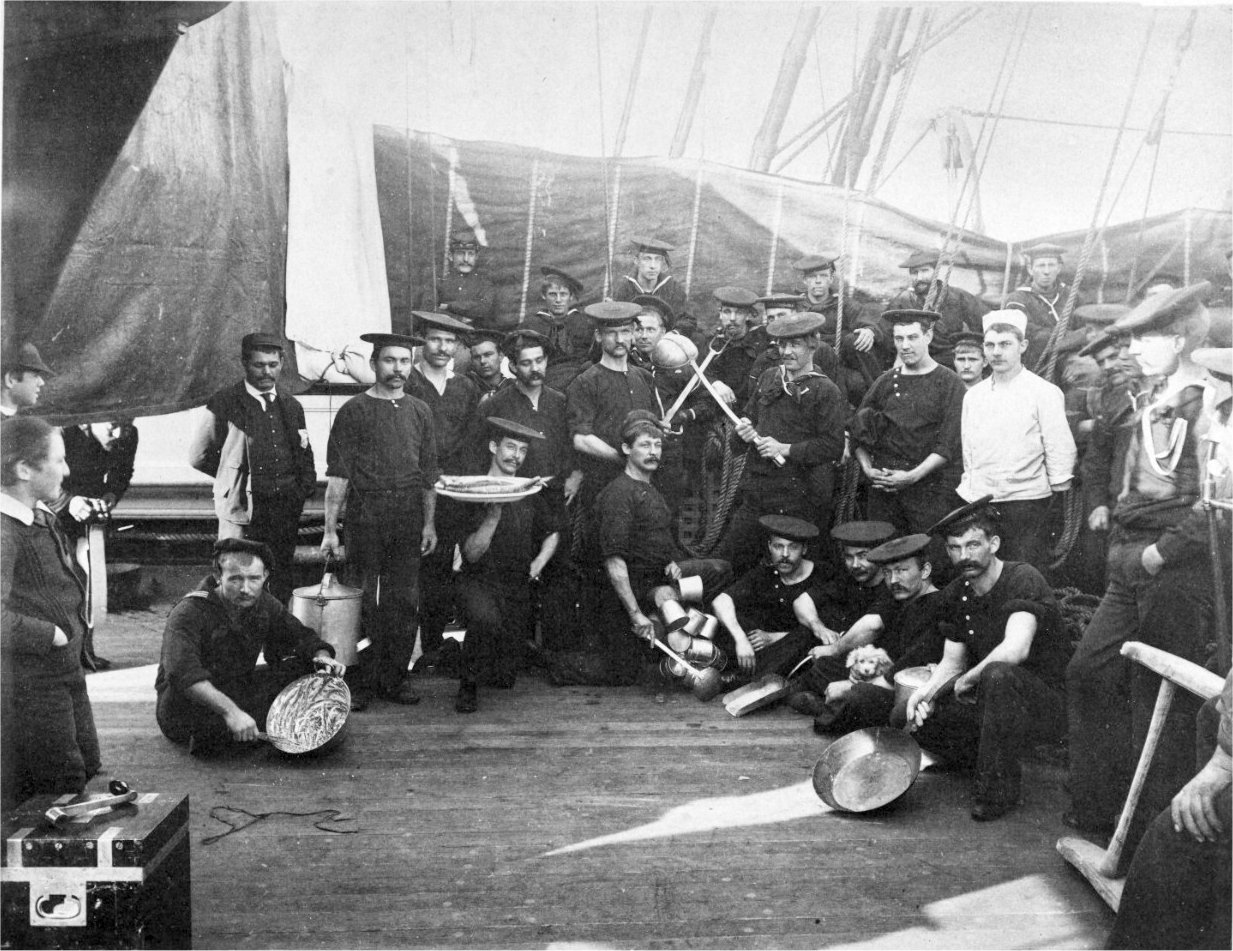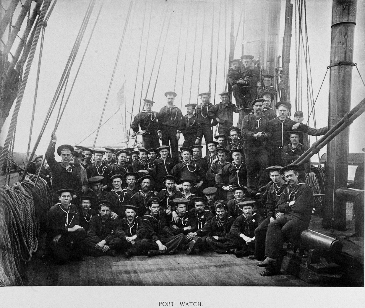 USS Pensacola men of the port watch, probably upon her return to the U.S. in February 1888. Note boat Howitzer used as a seat