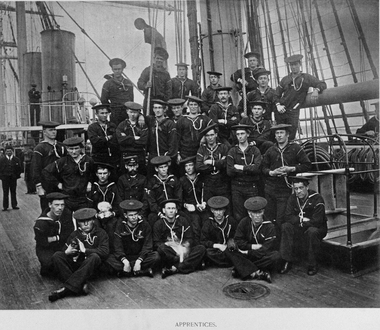 USS Pensacola apprentices pose with mascot cat and dogs, probably upon her return to the U.S. in February 1888. Note the coal