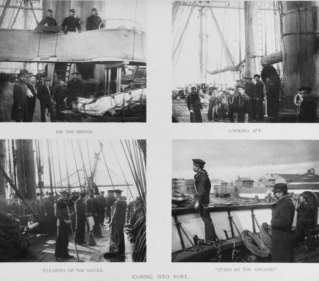 Four views of USS Pensacola taken on board as the ship comes into port, probably upon her return to the U.S. in February 1888.