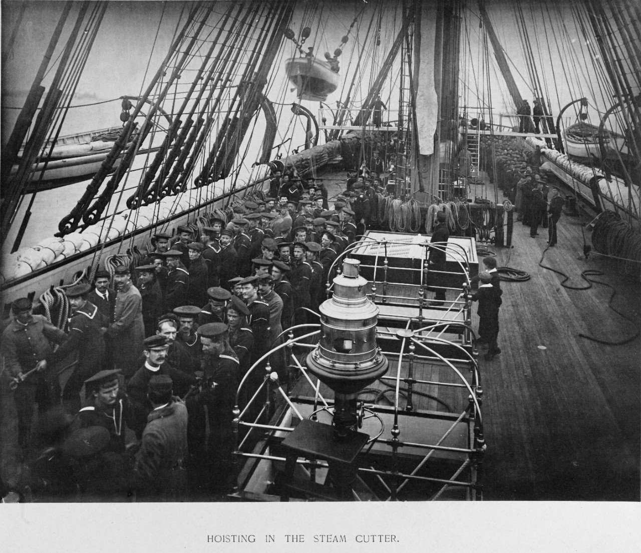 USS Pensacola's crew hoisting in the steam cutter, with tackle rigged to the fore and main lower yards, probably upon her