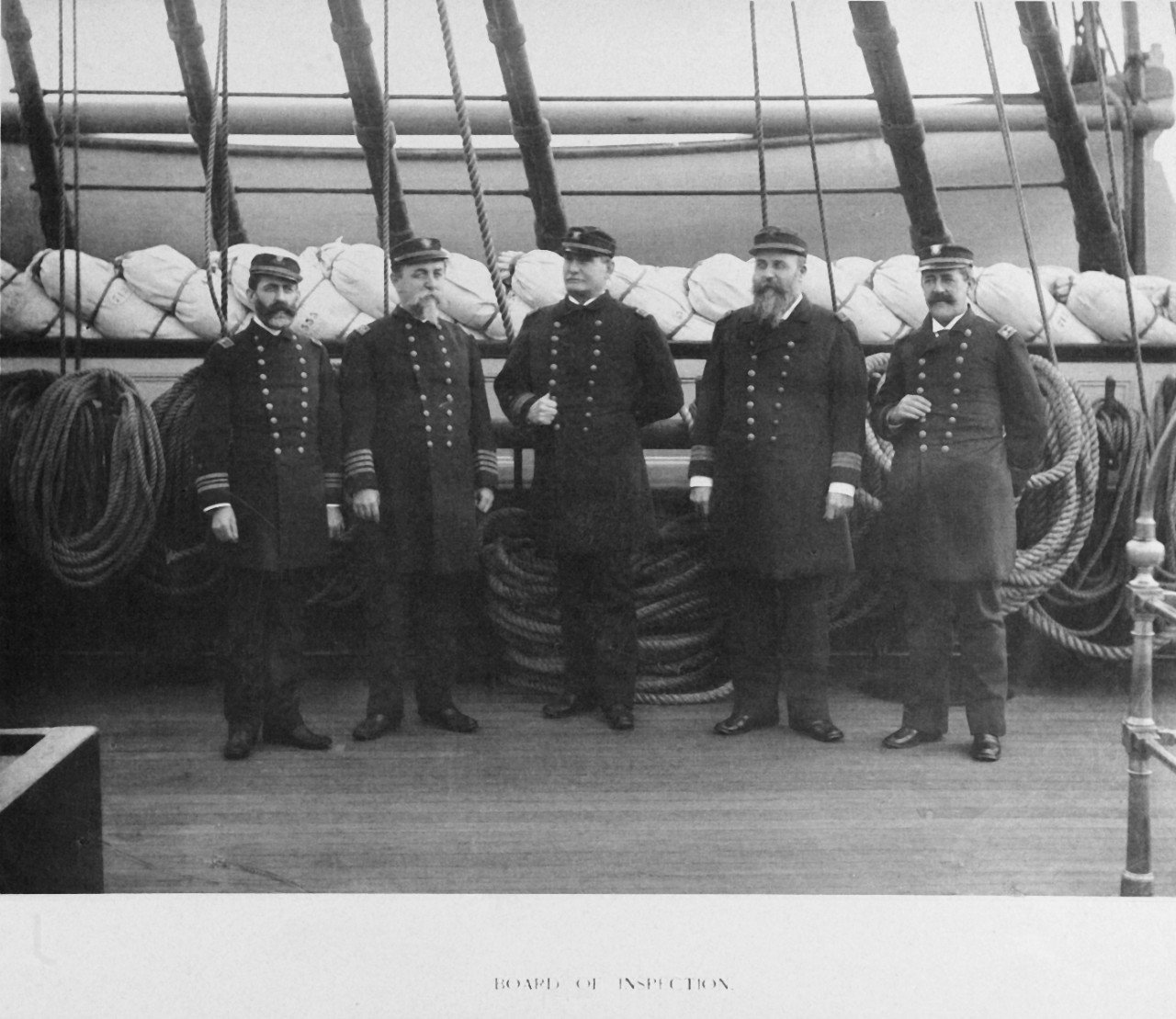 (left-right): Lieutenant Commander A.S. Snow; Captain C.S. Norton; Rear Admiral James E. Jouett (President); NavConst. P. Hichborn; and Chief Engineer P. Inch. Note