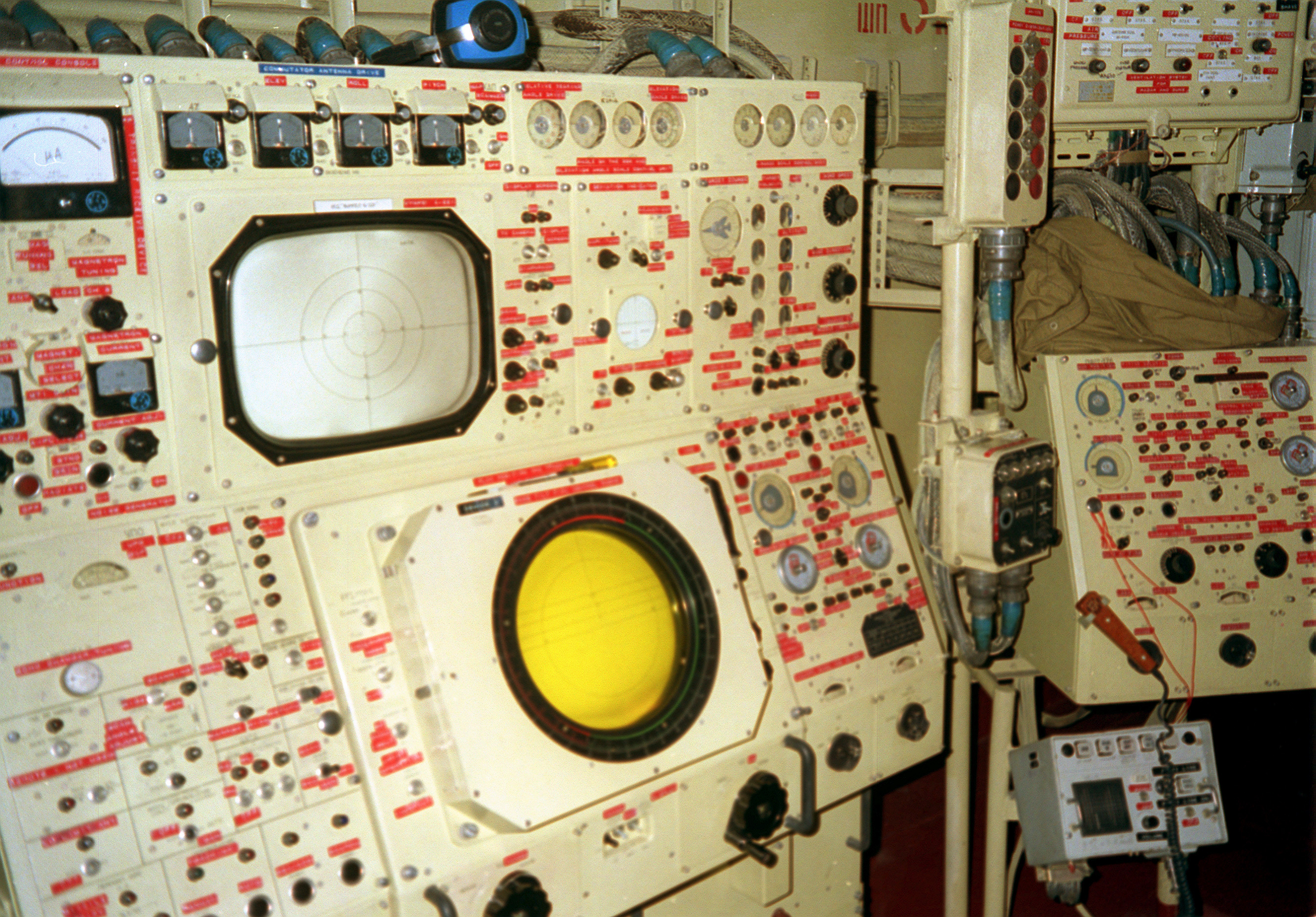 2915k | A console in the radar plot room of USNS Heddensee (185NS9201) while the ship is moored at the Naval Sea Systems Command facility at