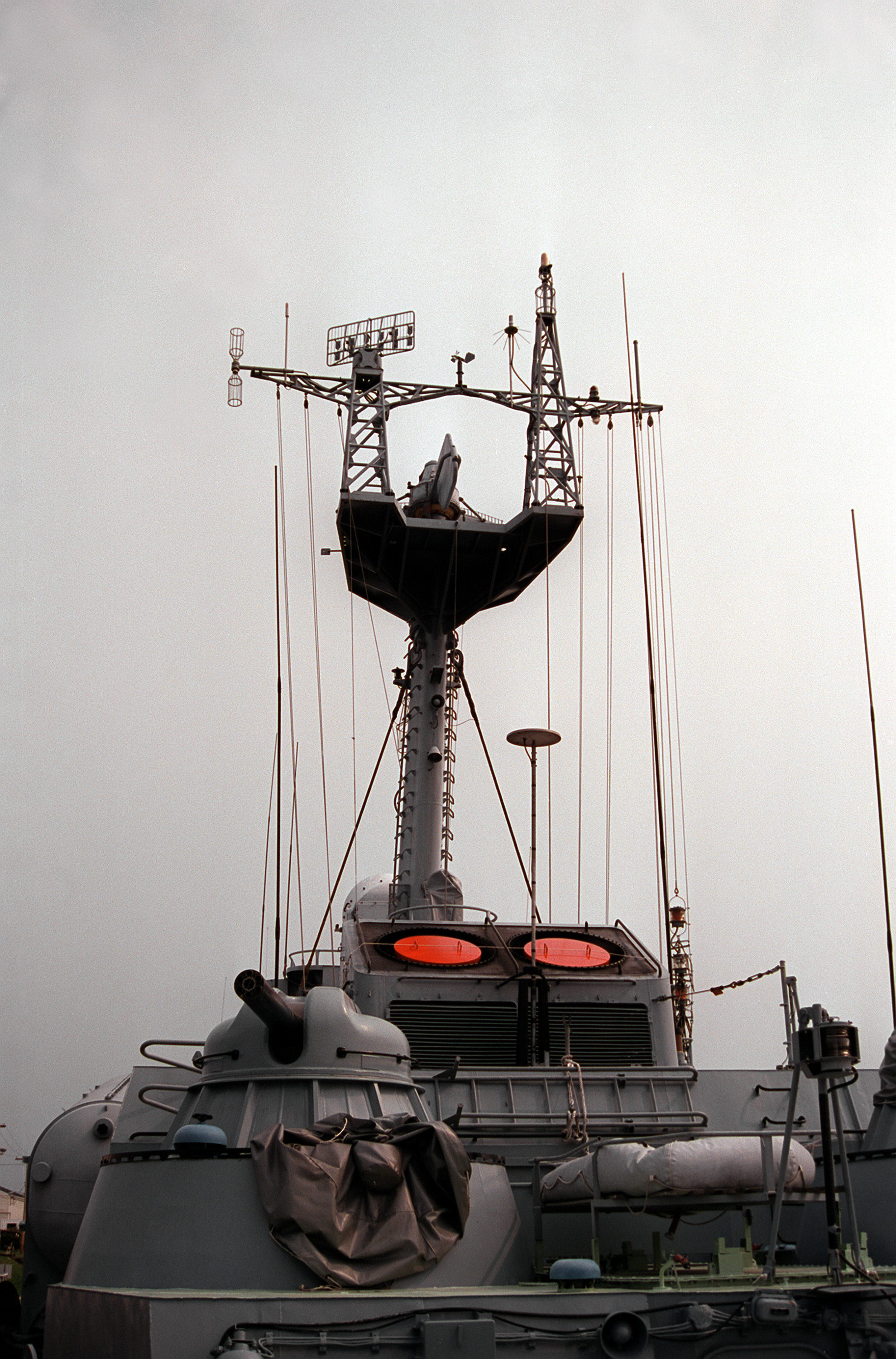 2086k | A view of the back side of the mast of USNS Hiddensee (185NS9201) with the Square Head identification-friend-or-foe (IFF) receiver on the top