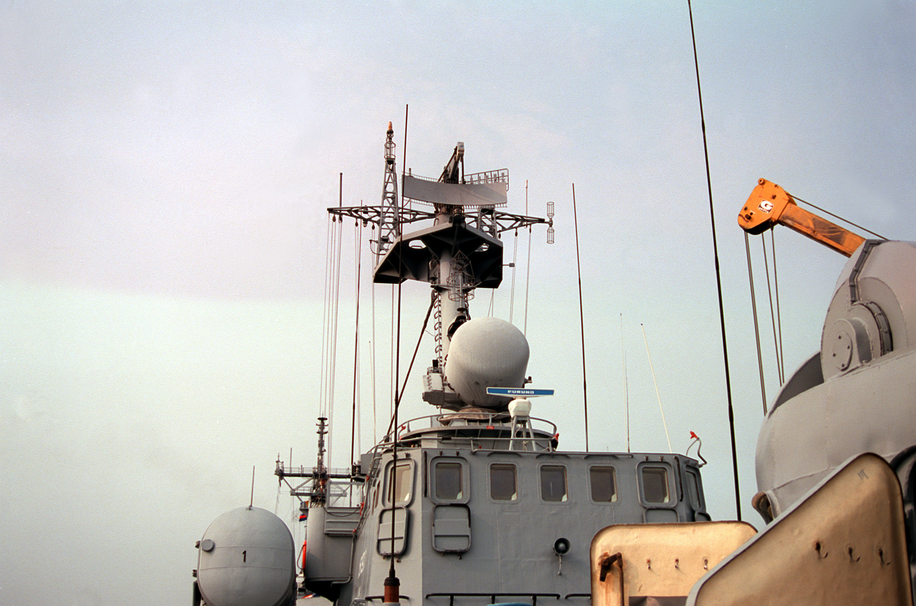 back side. On the front is the Plank Shave missile targeting radar antenna. Atop the bridge is a Kivach 3 surface search radar antenna. The dome unit above that is the Bass Tilt