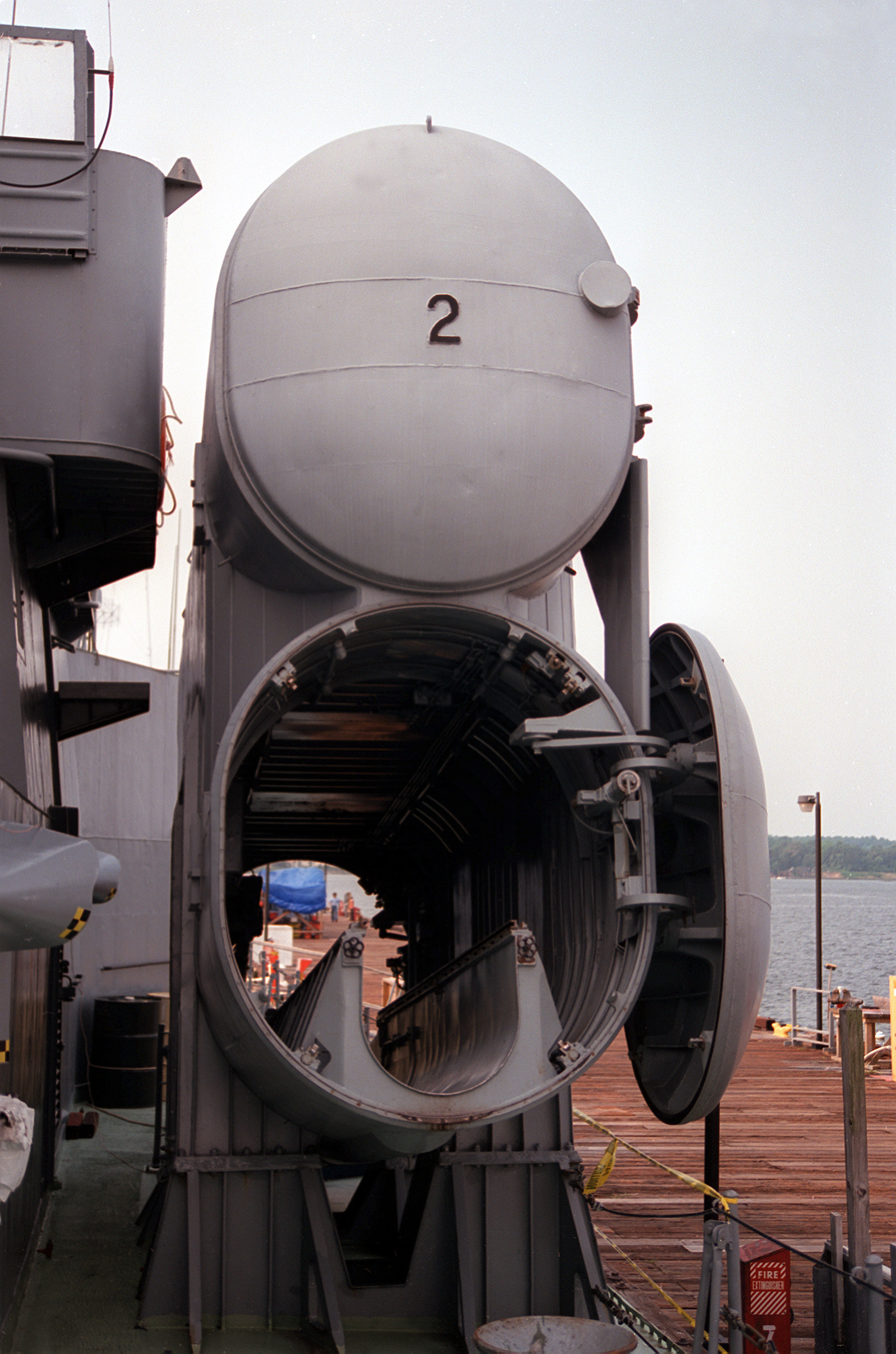 1643k | A front view of the open No. 4 launch tube for the P-15 SS-N-2c Styx SSM is unloaded from the No. 4 missile tube aboard the USNS Hiddensee