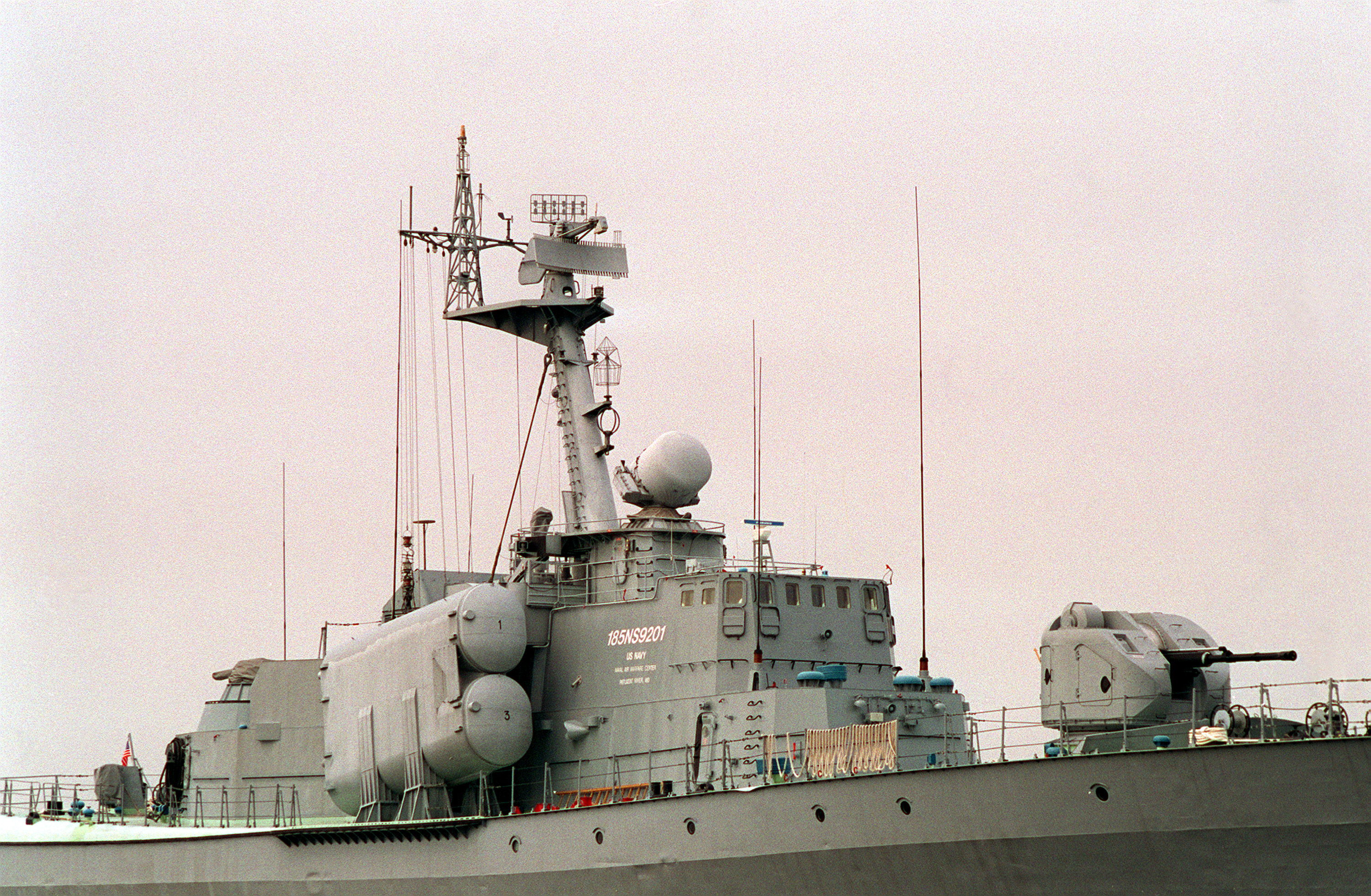 gunfire control radar antenna which controls both the AK-176 and the AK-630 gun systems. The ship is moored at the Naval Sea Systems Command facility at Solomons Annex, 25 August 1995