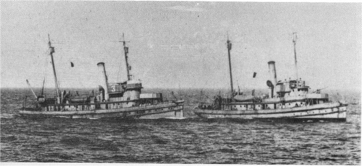 69k | USS Patapsco (Fleet Tug #10) left, and USS Patuxent (Fleet Tug #11) right, participate in minesweeping operations in the North Sea in 1919. US Navy photo NH 45255 from DANFS. |