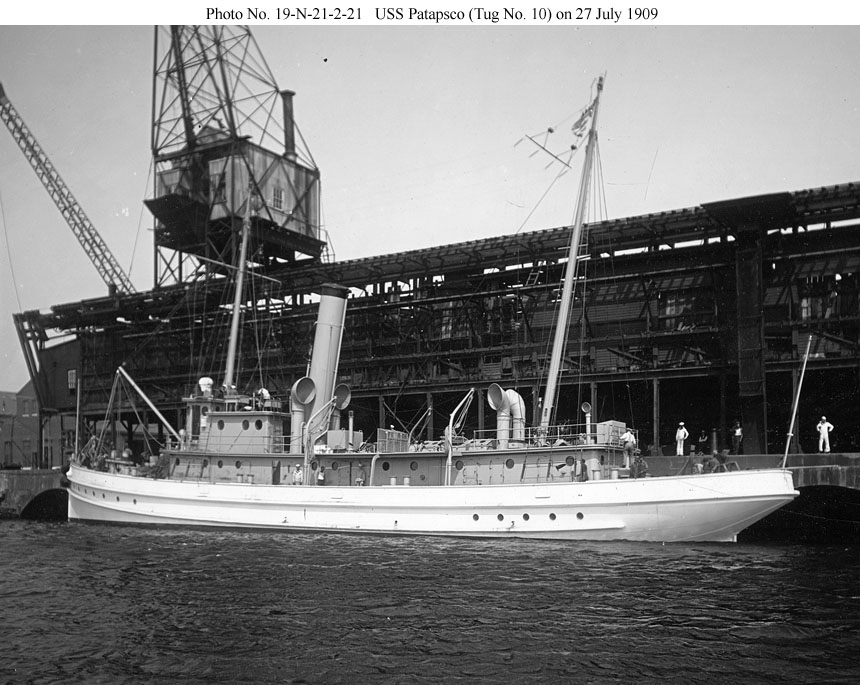164k | USS Patapsco (Fleet Tug #10) moored pierside Portsmouth Navy Yard, 27 July 1909. US National Archives, Photo #19-N-21-2-21 a US Navy Bureau of Ships photo now in the collections of the US National Archives, courtesy Shipscribe.com. |