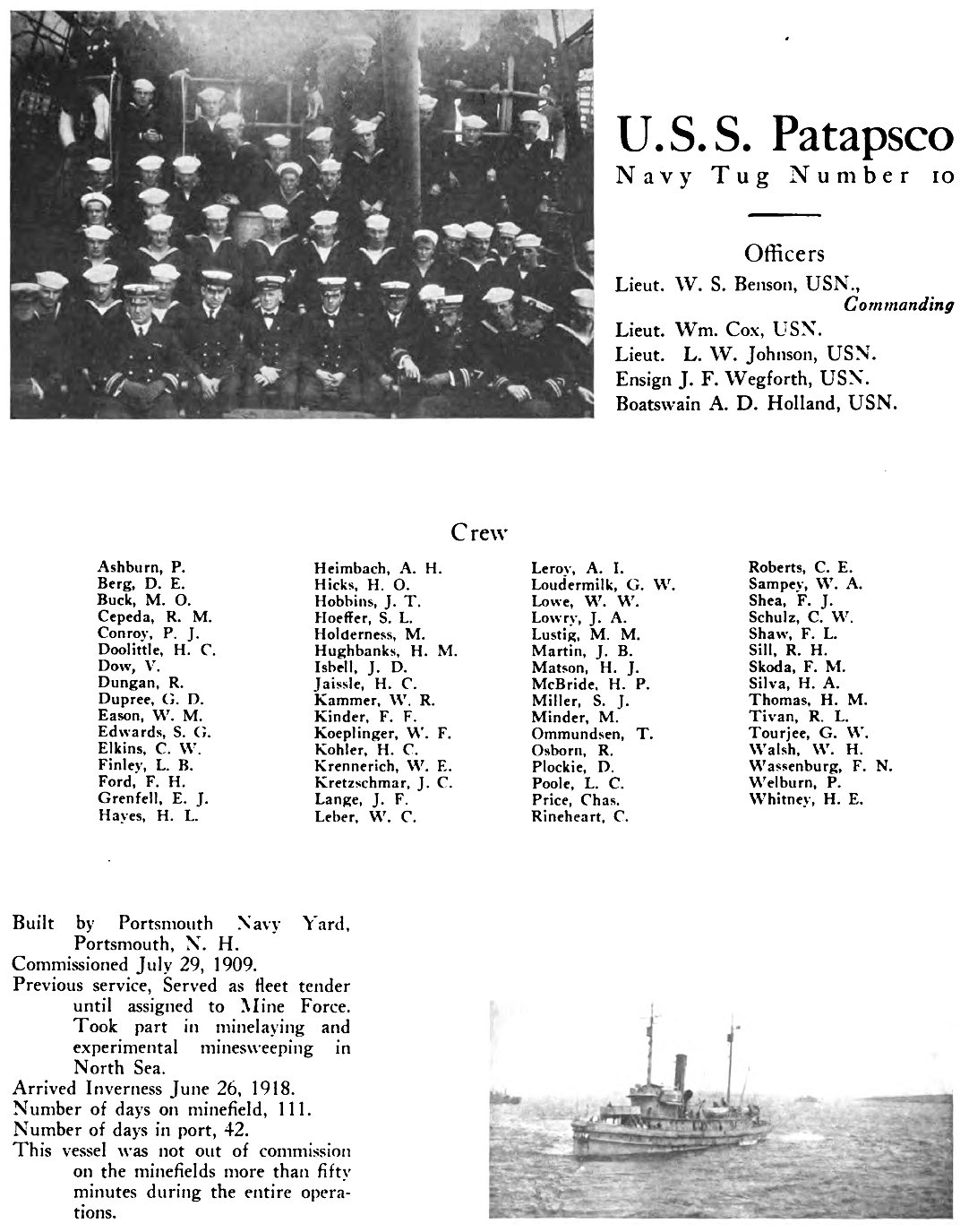 255k | USS Patapsco (Fleet Tug #10) crew list and photo, circa 1918-19. Photo from "Sweeping the North Sea Mine Barrage" by the U.S. Navy North Sea Minesweeping Detachment |