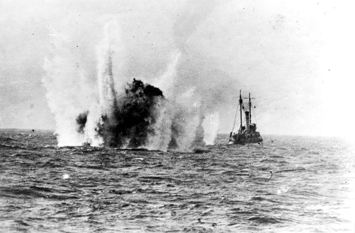 201k | USS Patapsco (Fleet Tug #10) with an explosion close astern during a minesweeping operation in the North Sea during World War I. US Naval History and Heritage Command Photo No. NH 109678 |