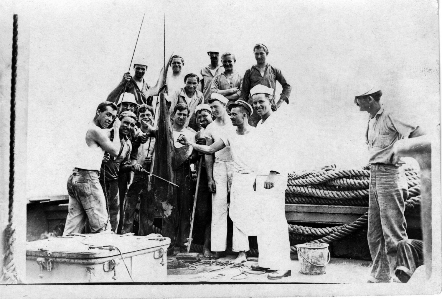 293k | USS Patapsco (Fleet Tug #10) crew showing the camara the shark they cought, circa 1916, location unknown. | Susan Graben | |