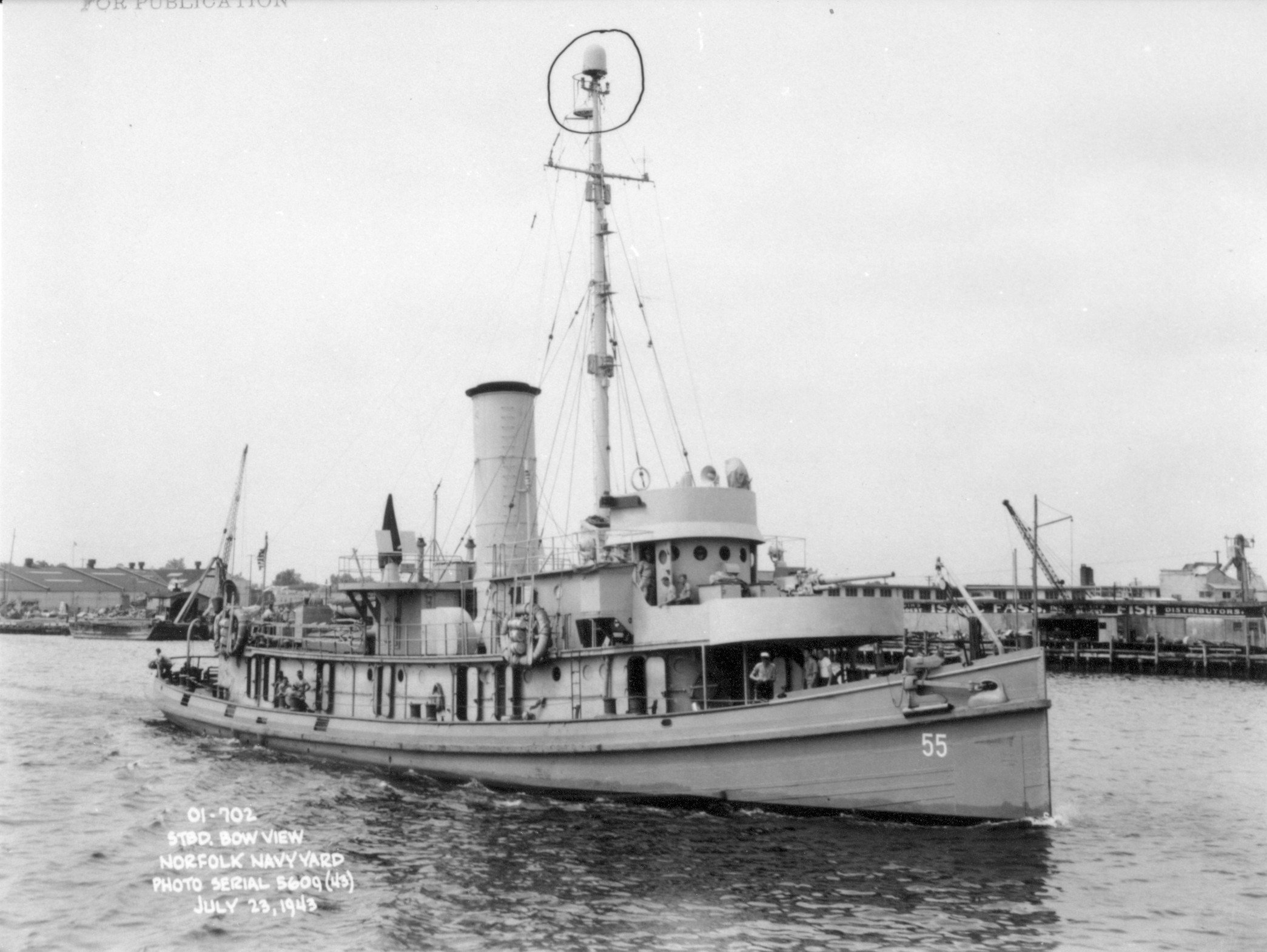 450k | USCGC Carrabasset (WAT-55) underway, off Norfolk Navy Yard, Portsmouth, VA, 23 July 1943. US Navy photo courtesy Coast Guard Tug Association. |