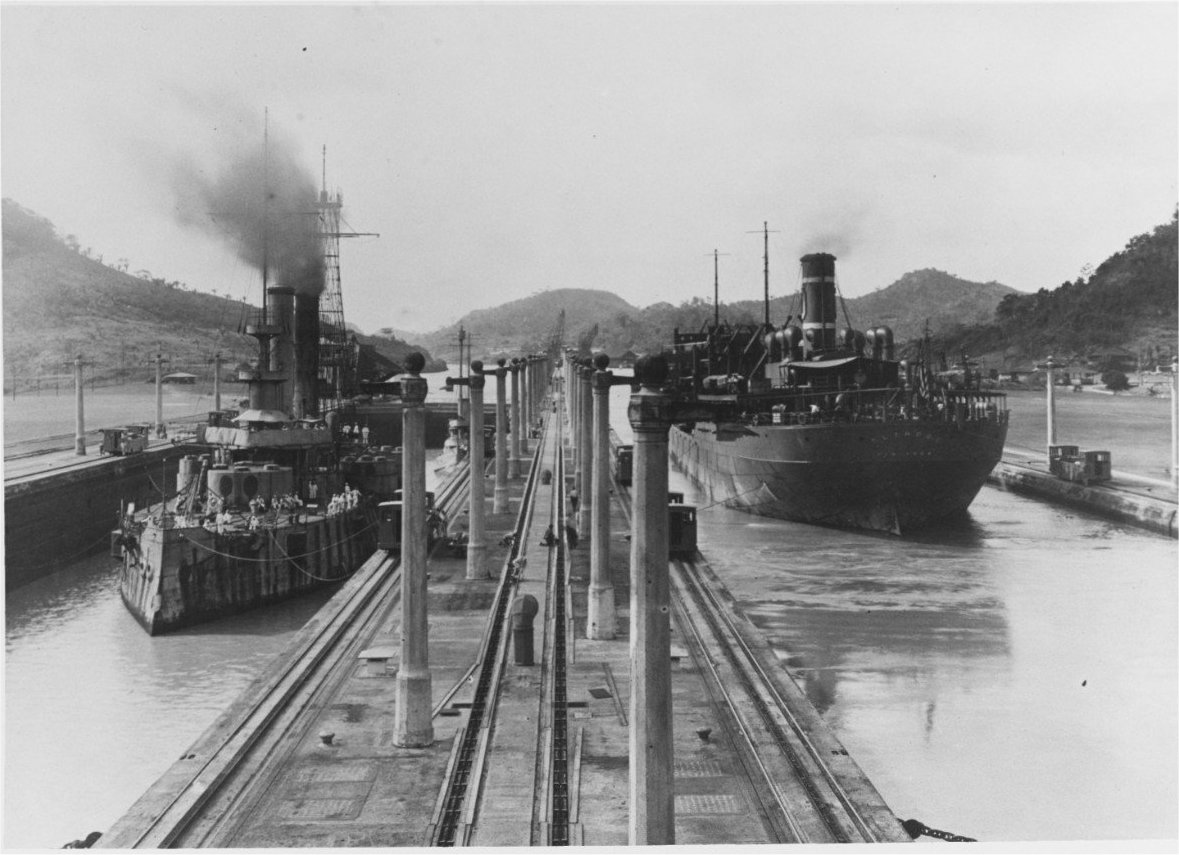 91k | USS Contocook (AT-36) is in the Pedro Miguel Lock, Panama Canal, astern of USS Coast Battleship No.4, while transiting the Panama Canal, 10 February 1923. SS Bethore is at right in the adjacent lock. US Navy photo # NH 83700 from the collections of the US Naval Historical Center |