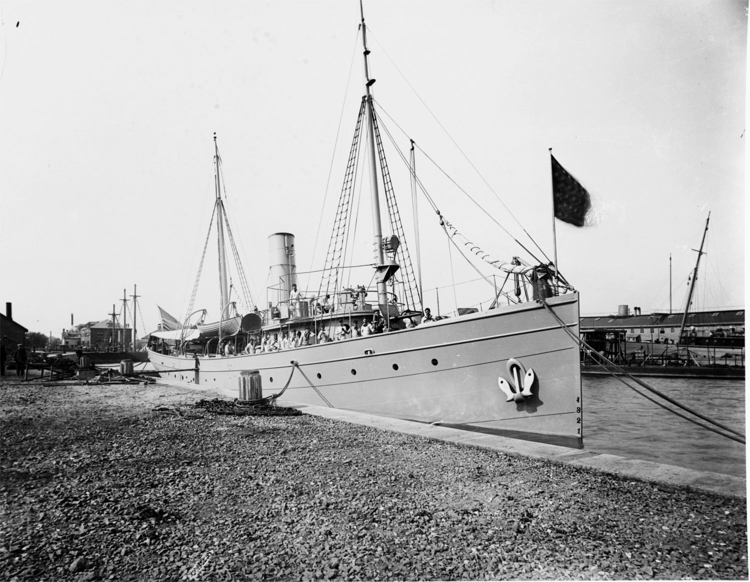 111k | USS Peoria at Philadelphia Navy Yard, circa May 1898, completing conversion to an auxiliary gunboat for Spanish-American War duty. Note that this former pilot boat lacks a pilot house. The receiving ship USS Richmond is behind her.