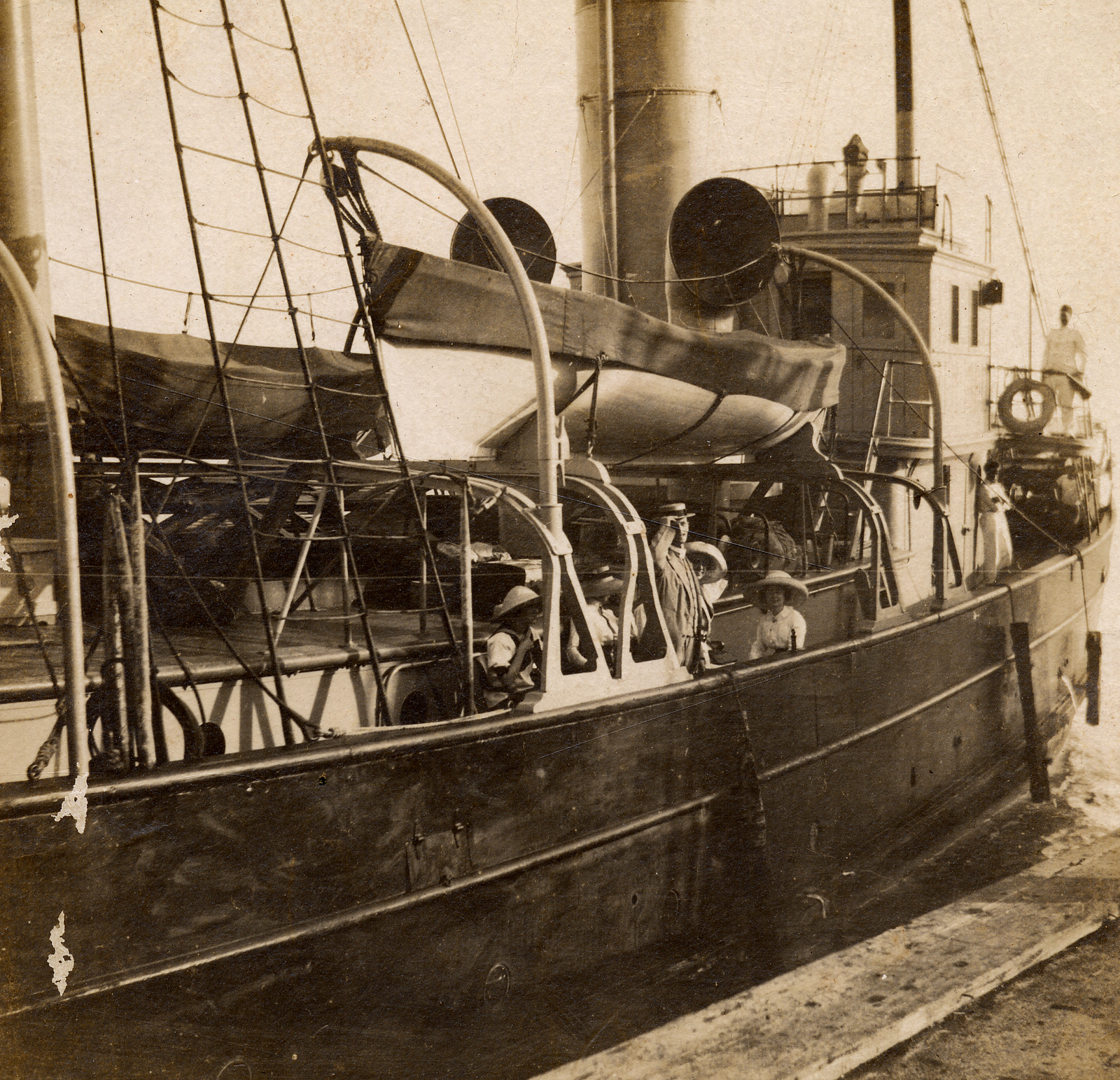 1945k | The Steam Tug USS Peoria leaving her mooring at Key West, Fl, 19 May 1913. Note the civilians on board. De Wolf and Wood Collection. Image from Flickr courtesy of Florida Keys Public Libraries photo # MM00038162x. |