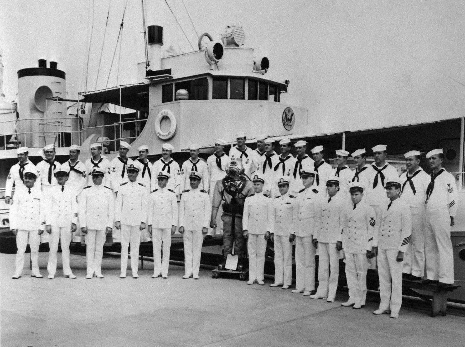 Potomac was the backdrop for a group photo of the Navy Diving School personnel. US National Archives Photo # 80-G-7166, a US Navy Photo now in the collections of the US National Archives. |