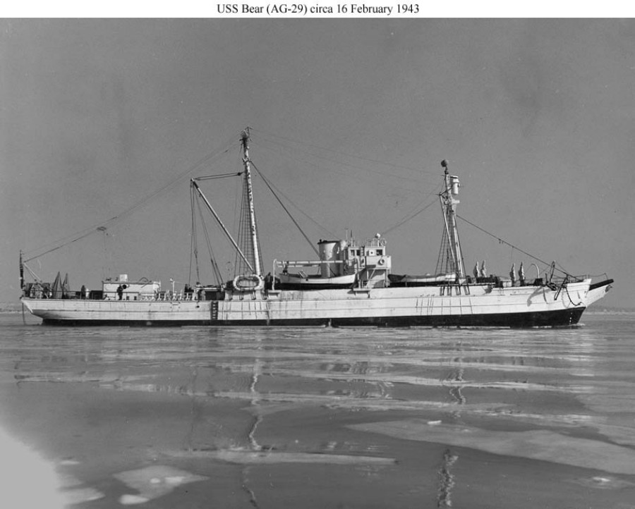 101k | USS Bear (AG-29) near the Boston Navy Yard, 16 February 1943. The ship was refitted in 1942 for operation by the Navy on the Northeast Greenland Patrol. Her mizzen mast and aircraft were among the items removed. US Navy photos from the collections of the US Naval History and Heritage Command |
