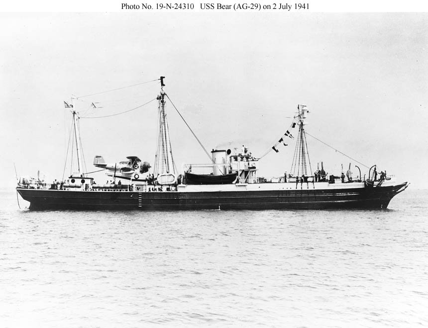 59k | USS Bear (AG-29) at anchor, date and location unknown. Note the seaplane on her aft deck. US Navy photo |