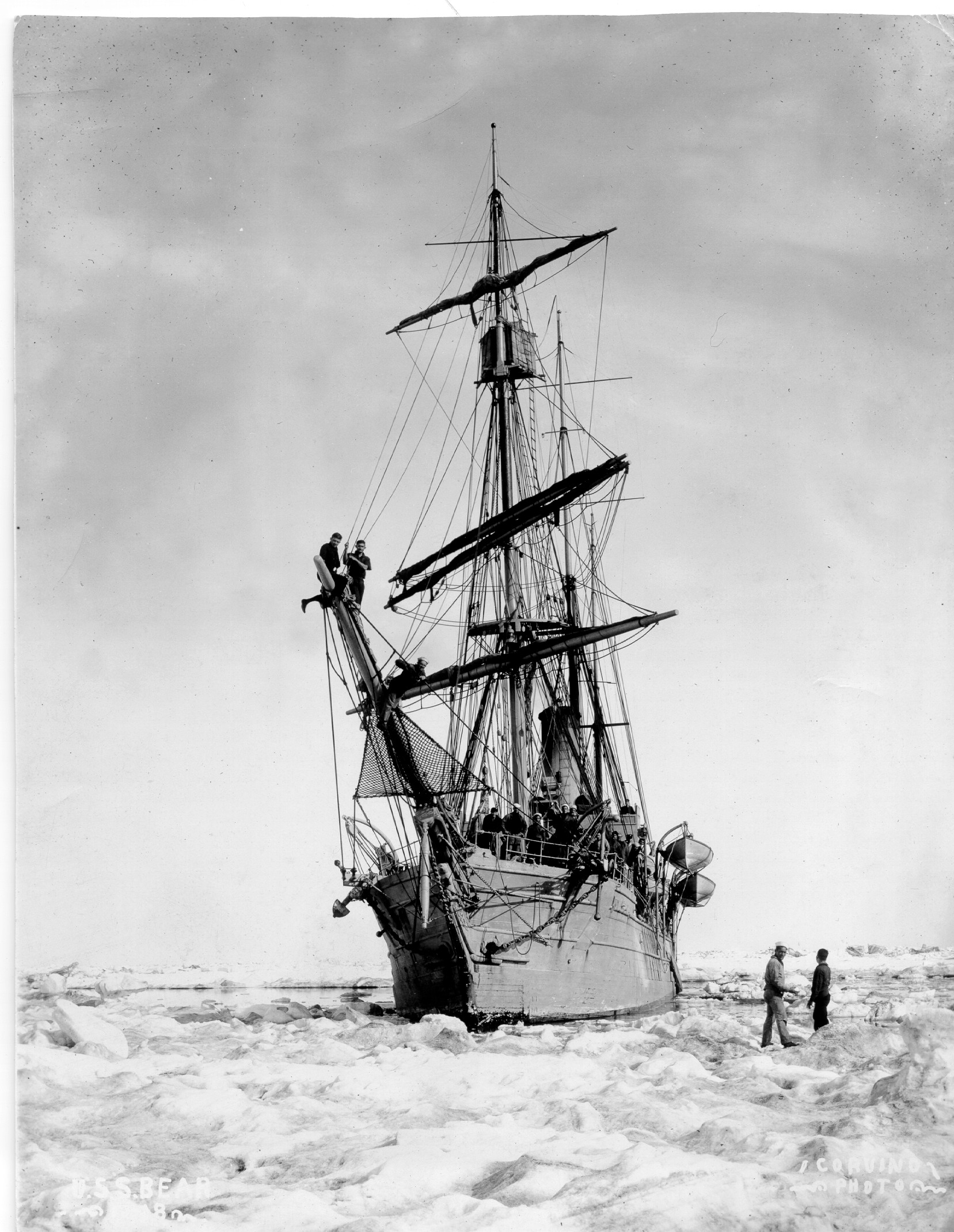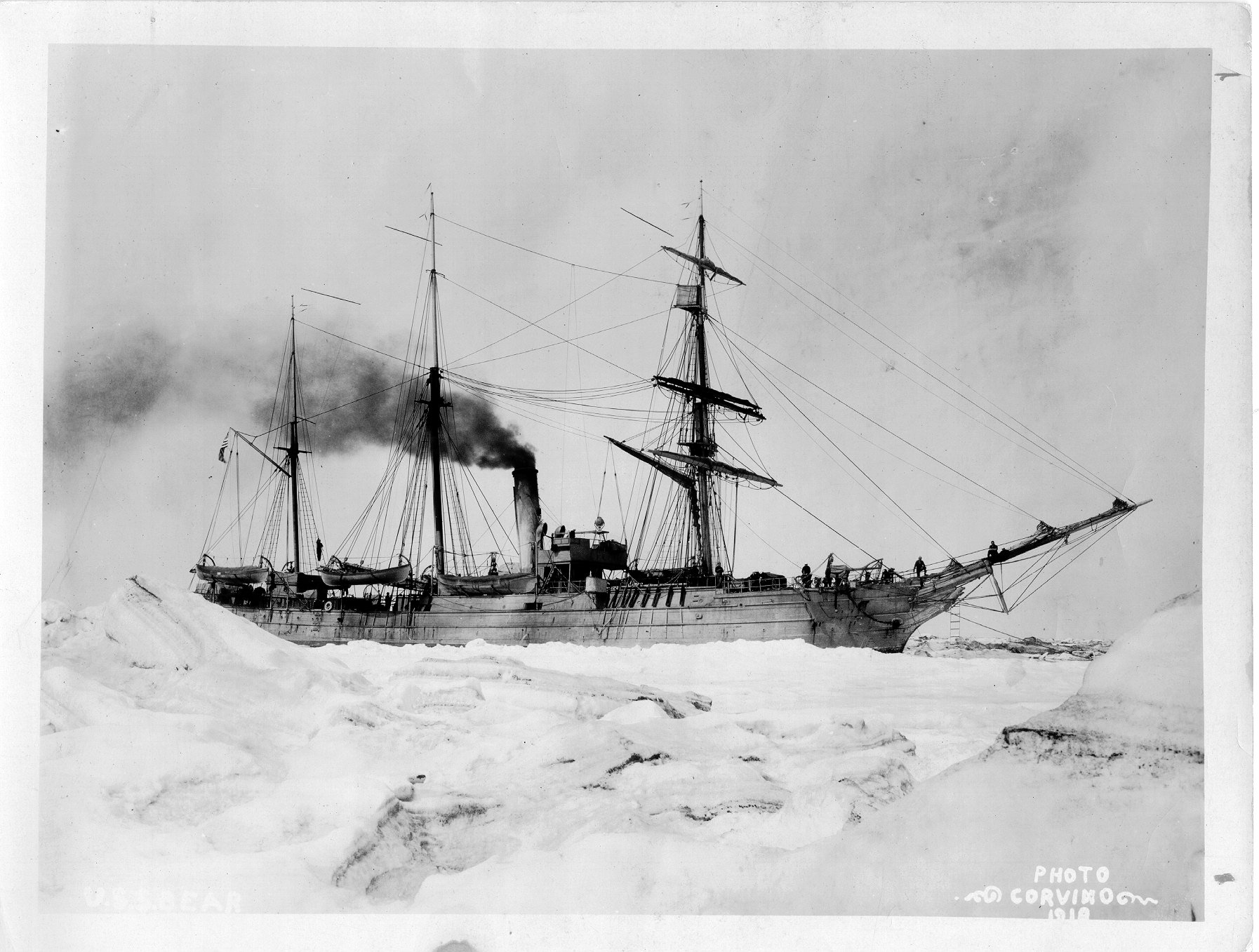 398k | USRC Bear in the Arctic ice, circa 1910. US Coast Guard photo by Corvino, no photo number. |