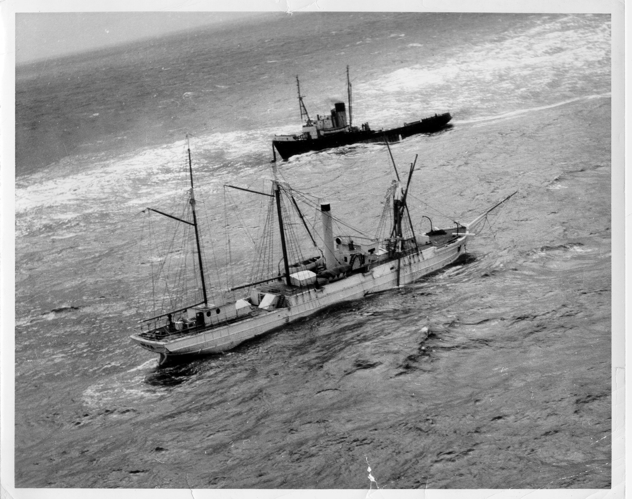 862k | SS Arctic Bear her towline parted and foremast collapsed, begins her final journey down to the sea as the tug Irving Birch stands by helpless to save her. Bear sank at 8:15 P.M., Tuesday, 19 March 1963, 90 miles south of Cape Sable, Nova Scotia, 260 miles east of Boston. US Coast Guard photo # 1CGD-03-19-63(03). |