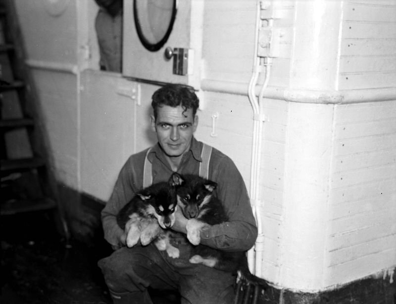 54k | Aboard USS Bear (AG-29) Hollis E. "Pops" Richardson, holding a couple of Husky puppies, November 1939.