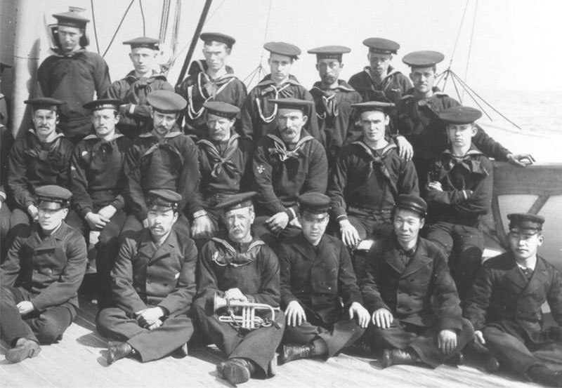 86k | USRC Bear crew photo including Asian enlisted men seated on bottom row, date unknown.
