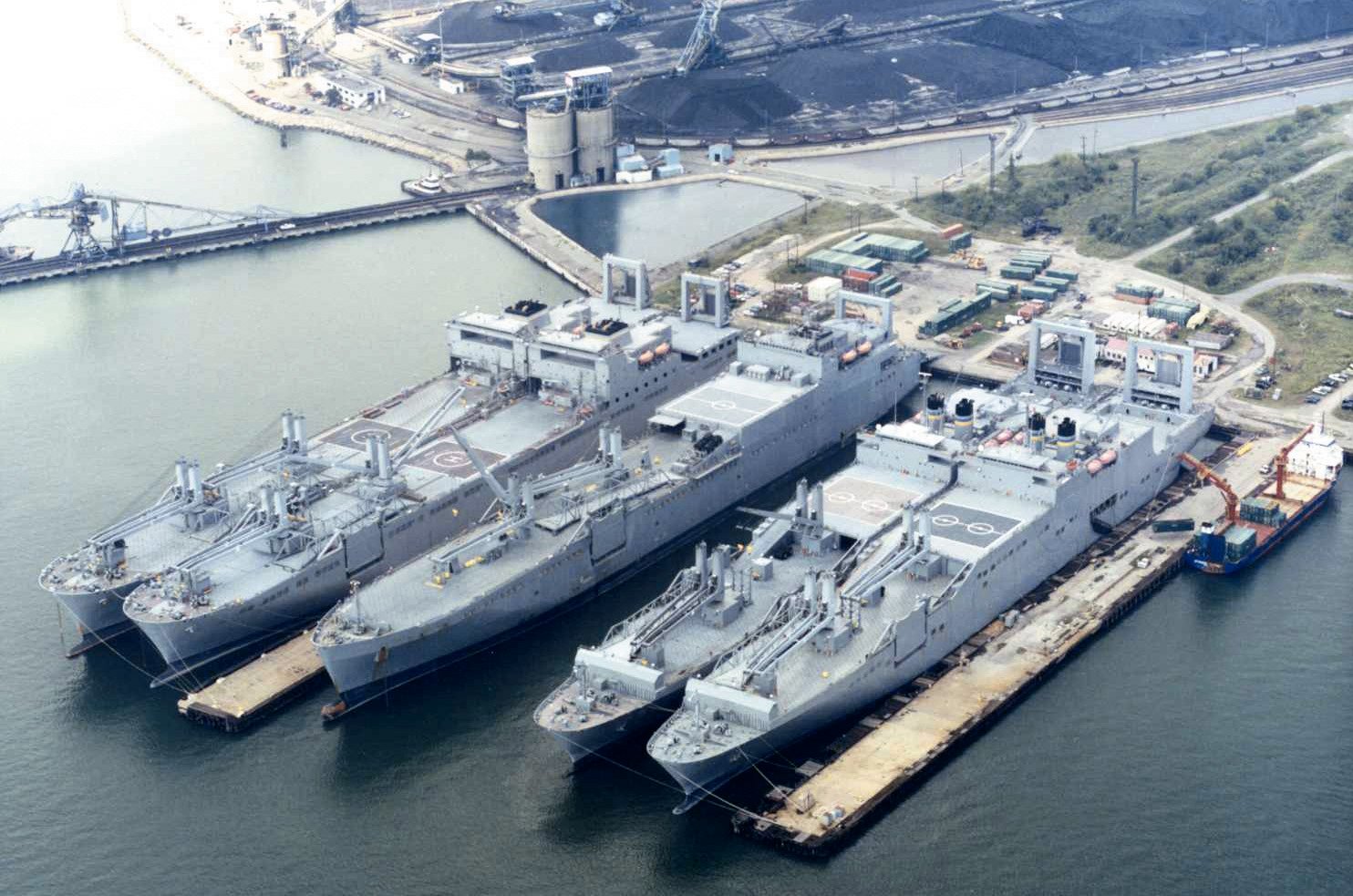 281k | Five large, medium-speed, roll-on/roll-off ships, or LMSRs (left to right) moored in their lay berths at Newport News, VA., 2002. From left to right: