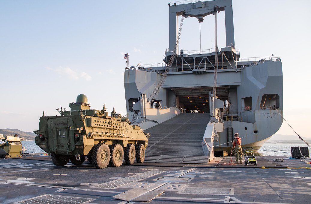 140k | Sailors attached to Amphibious Construction Battalion 1 guide Stryker Infantry Carrier Vehicles onto the ramp Military Sealift Command