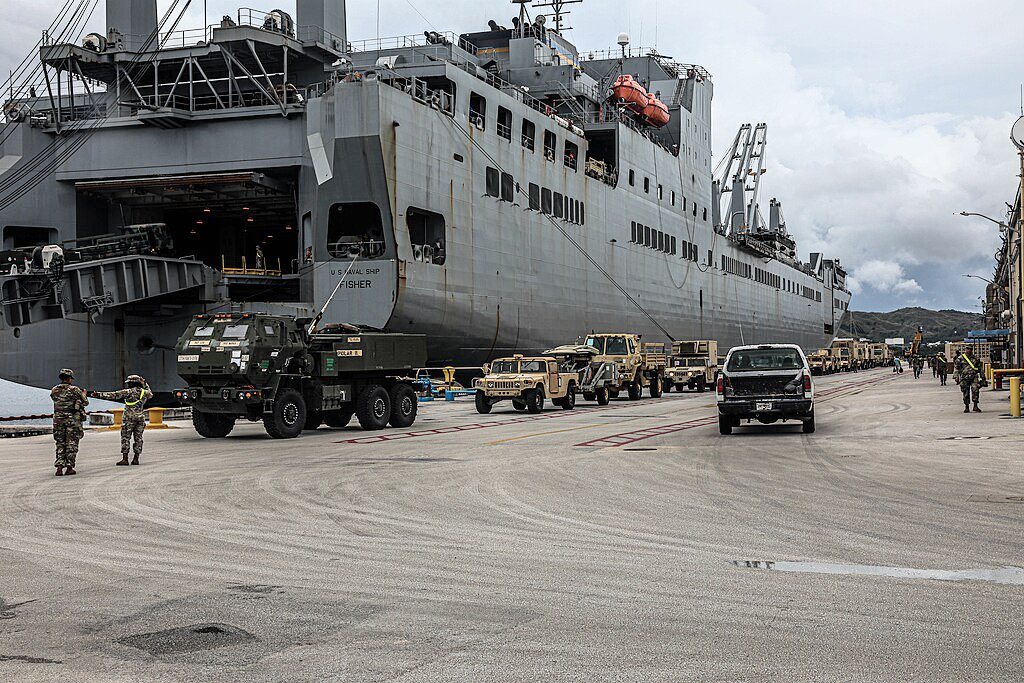 230k | Soldiers from across U.S. Army Pacific unloading vehicles from USNS Fisher (T-AKR-301) at Naval Base, Guam, 31 July 2021. for Exercise
